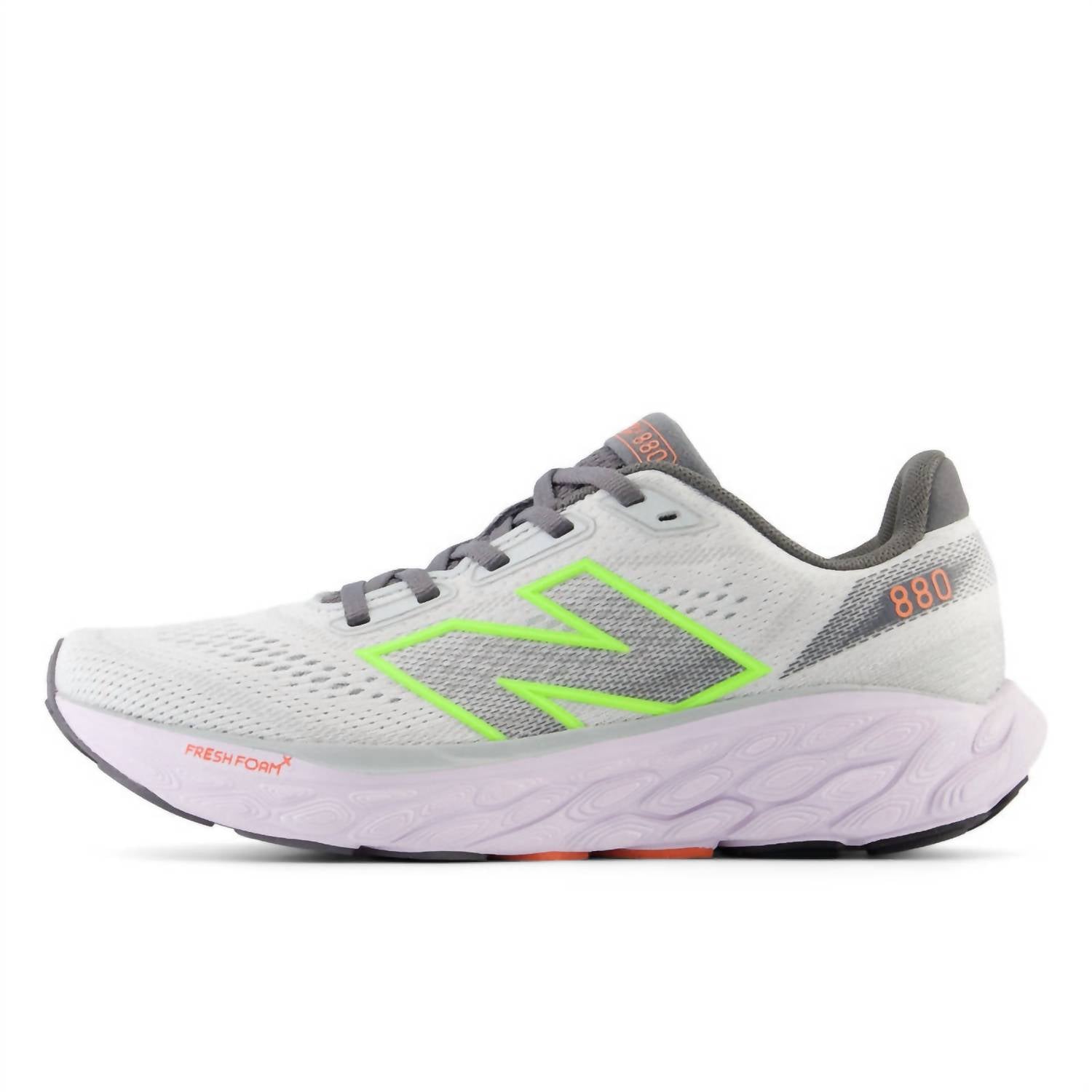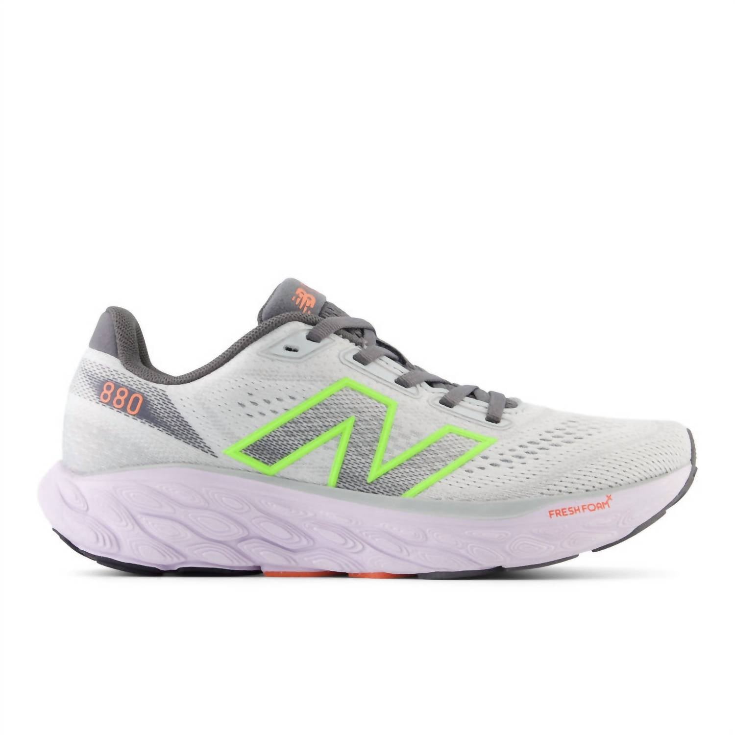 Featuring a lightweight design, the Women's 880 V14 Running Sneakers by New Balance provide unparalleled comfort and support. Crafted with Fresh Foam X midsole composed of approximately 3% bio-based content, these sneakers offer exceptional cushioning for a superior running experience. Weighing just 209 grams (7.4 oz), they are ideal for neutral runners who require no additional stability. The stylish combination of Grey Matter with Taro and Bleached Lime Glo makes them a perfect blend of function and fashion.
