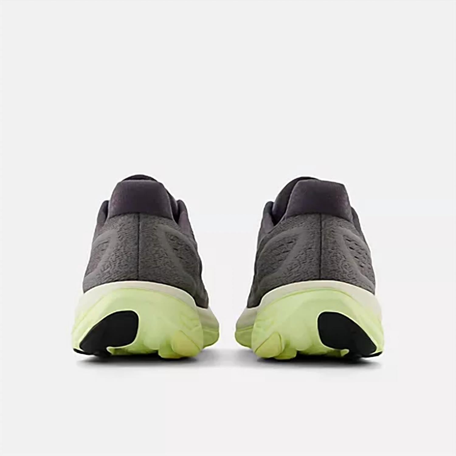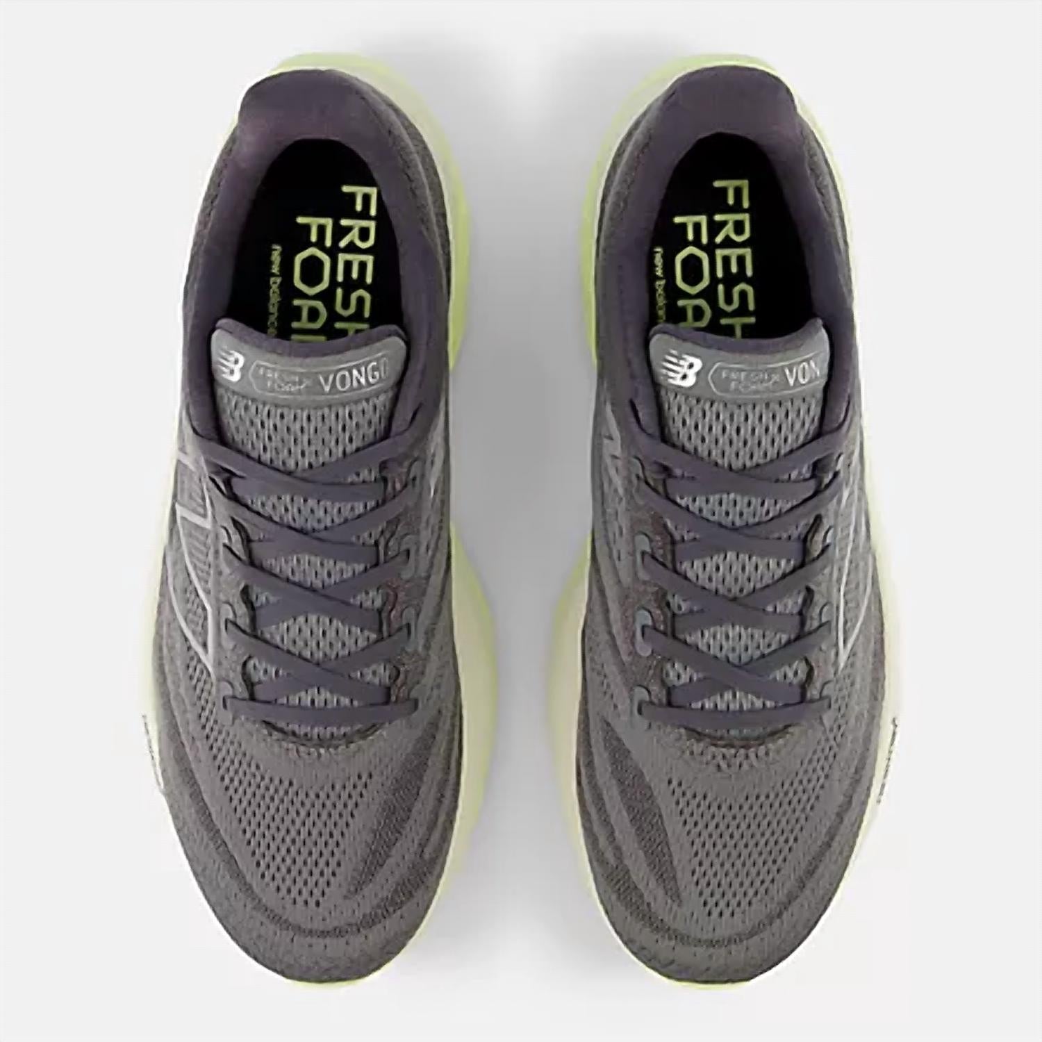 Enhance your run with the Men's Vongo Running Sneakers by New Balance, featuring a supportive medial zone for stability. Made with an engineered mesh and synthetic upper material, these shoes offer structure, support, and breathability with no-sew overlays for a comfortable fit. Weighing 303 grams (10.7 oz), they boast a low heel height and a round toe shape, perfect for women seeking a stable ride. Available in a striking Harbor Grey with Limelight and Silver Metallic, these sneakers promise style and performance.