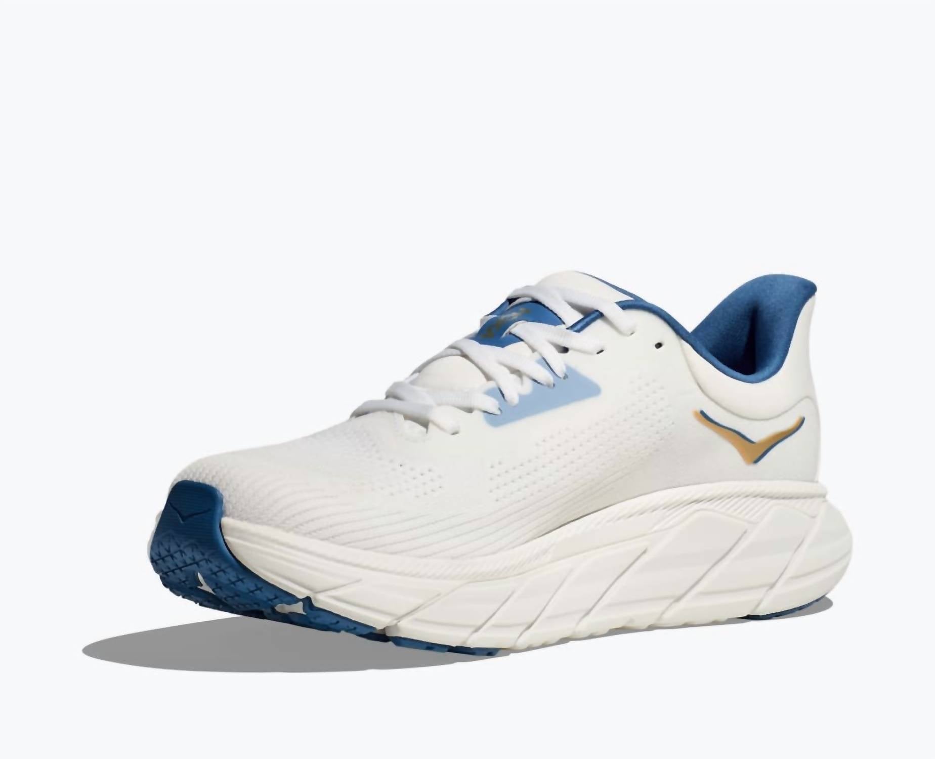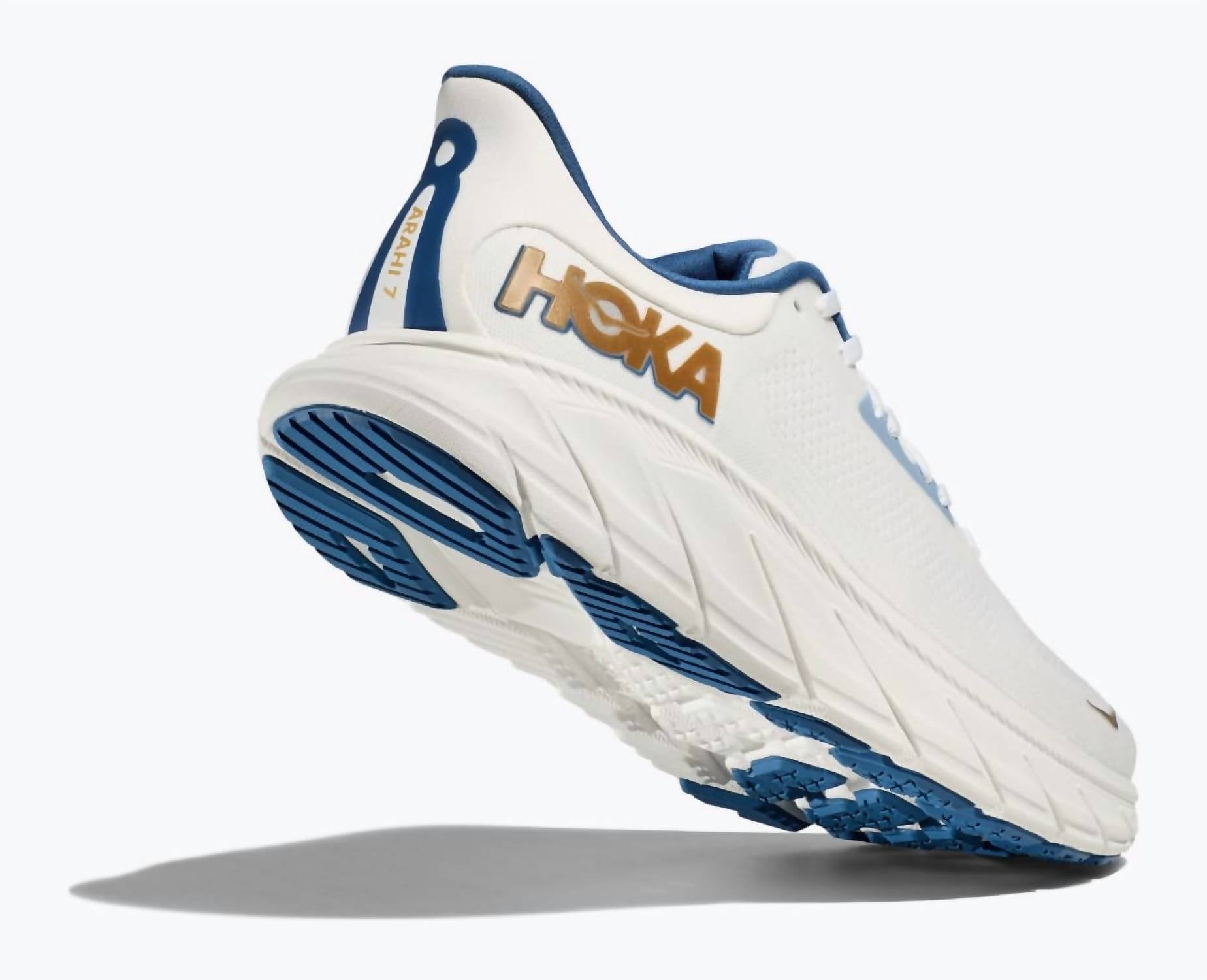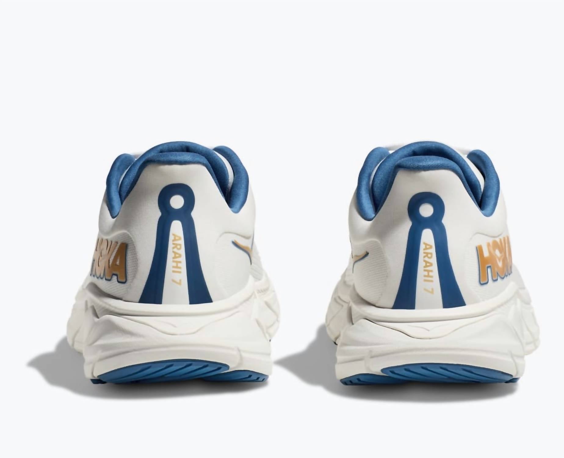 Introducing the Men's Arahi 7 Shoe by Hoka, a sleek stability shoe perfect for everyday running and walking. Designed with a supportive flat-knit upper and dual gusset to enhance midfoot lockdown, it ensures comfort and durability with its J-Frame™ midsole support and compression molded EVA midsole. The shoe features a plush tongue, zonal rubber, and an extended heel pull for effortless wear. Its low, flat heel and round toe shape make it ideal for fitness and athleisure looks, available in a striking Blue/Frost color.