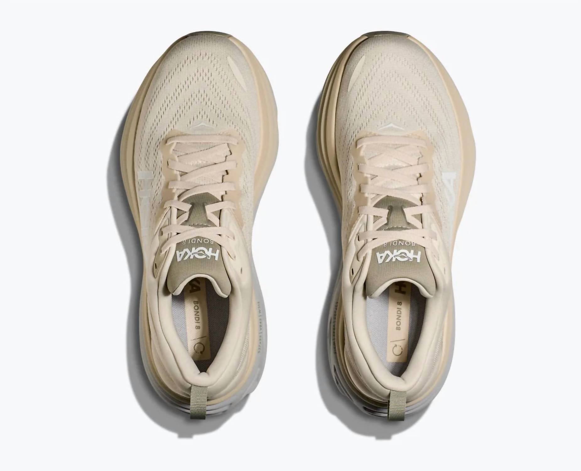 Experience superior comfort with the Hoka Men's Bondi 8 Sneaker in Oak Milk Barley, crafted using engineered mesh construction and featuring a flat heel for optimal everyday support. This shoe incorporates a partially gusseted tongue, 40% recycled polyester eyestay lining, and an Ortholite® hybrid sockliner for enhanced cushioning. Its lightweight, resilient foam and durabrasion rubber outsole are designed for effective weight savings and durability. Made with a commitment to sustainability, this vegan sneaker uses up to 87% recycled polyester materials.