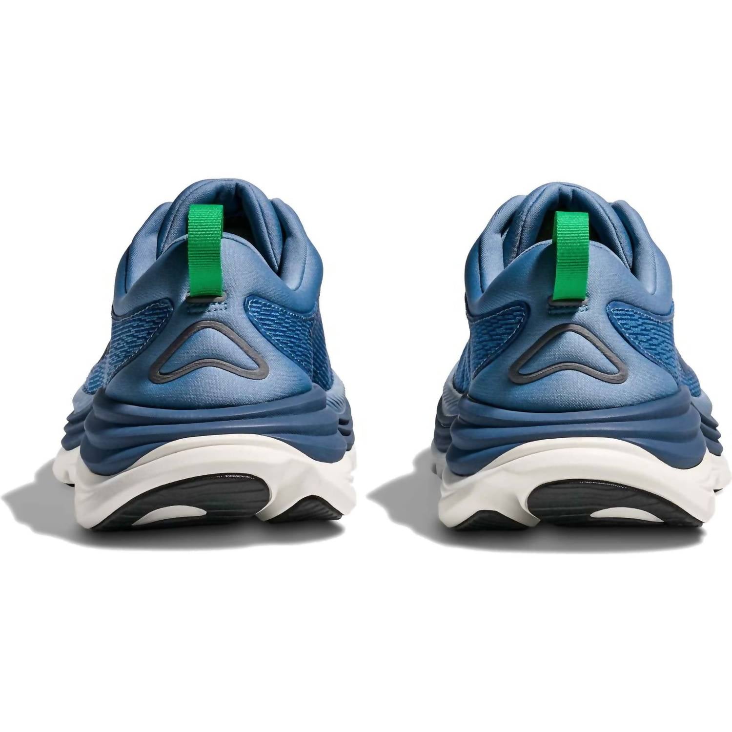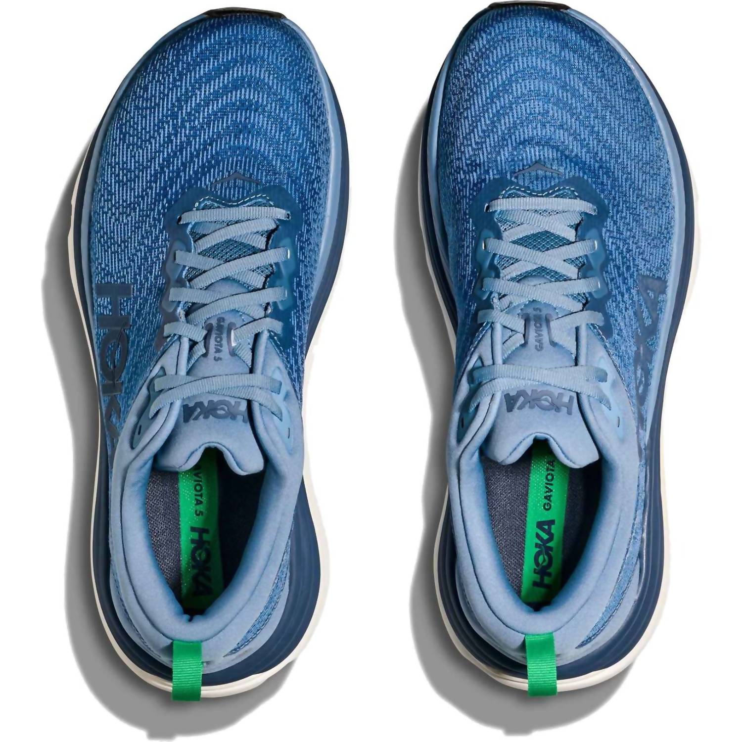 Introducing the Men's Gaviota 5 Sneakers by Hoka, engineered for comfort and stability during road running and walking. These sneakers feature a creel jacquard mesh upper for enhanced breathability, with a plush tongue and collar offering exceptional ankle comfort. They are crafted with eco-friendly materials, including 100% recycled polyester midfoot brace ghillies and a combination of 70% recycled nylon and 30% recycled polyester laces. Designed for a standard fit, they incorporate a soft EVA foam midsole and the early stage MetaRockerâ„¢ for smooth heel-to-toe transitions. Ideal for spring athleisure or Thanksgiving workouts in the sophisticated Downpour Thunder Cloud color.
