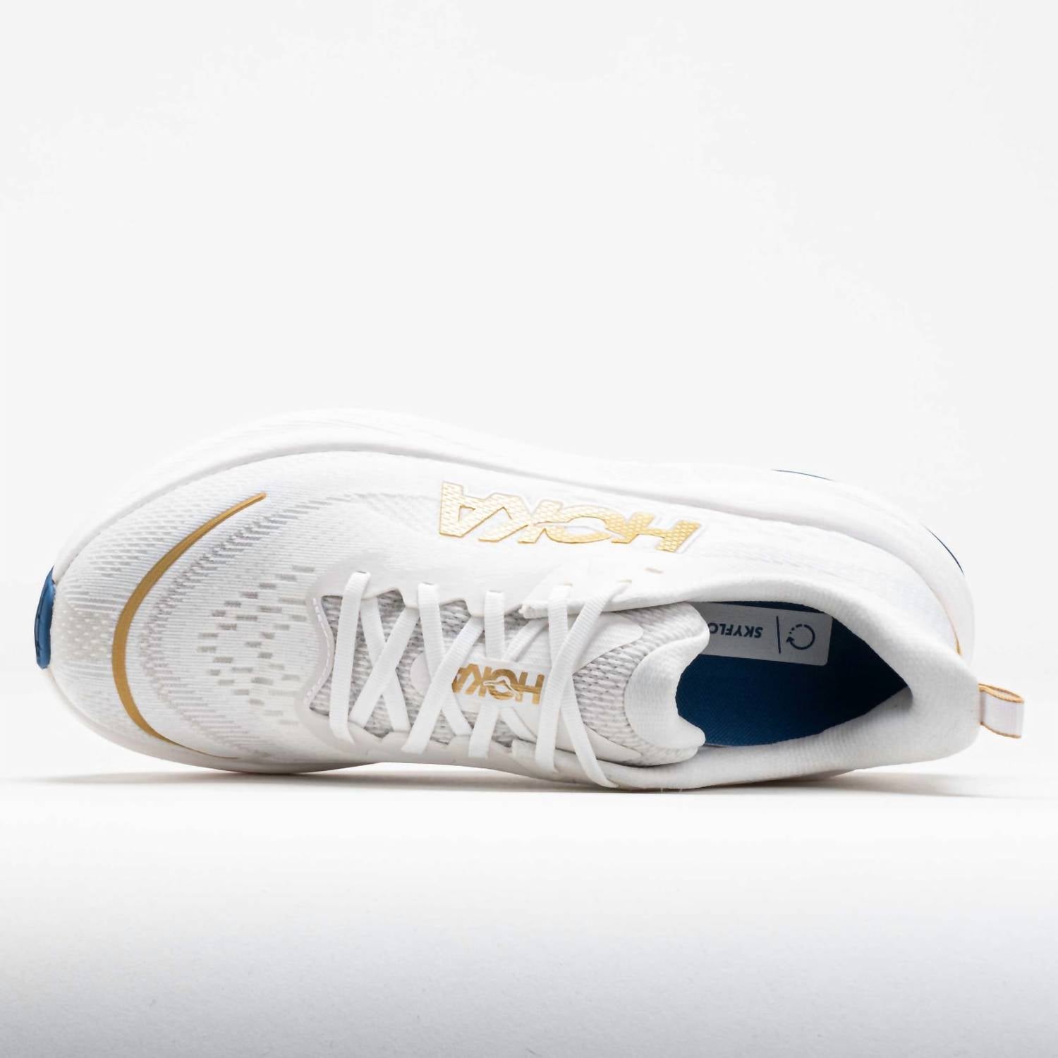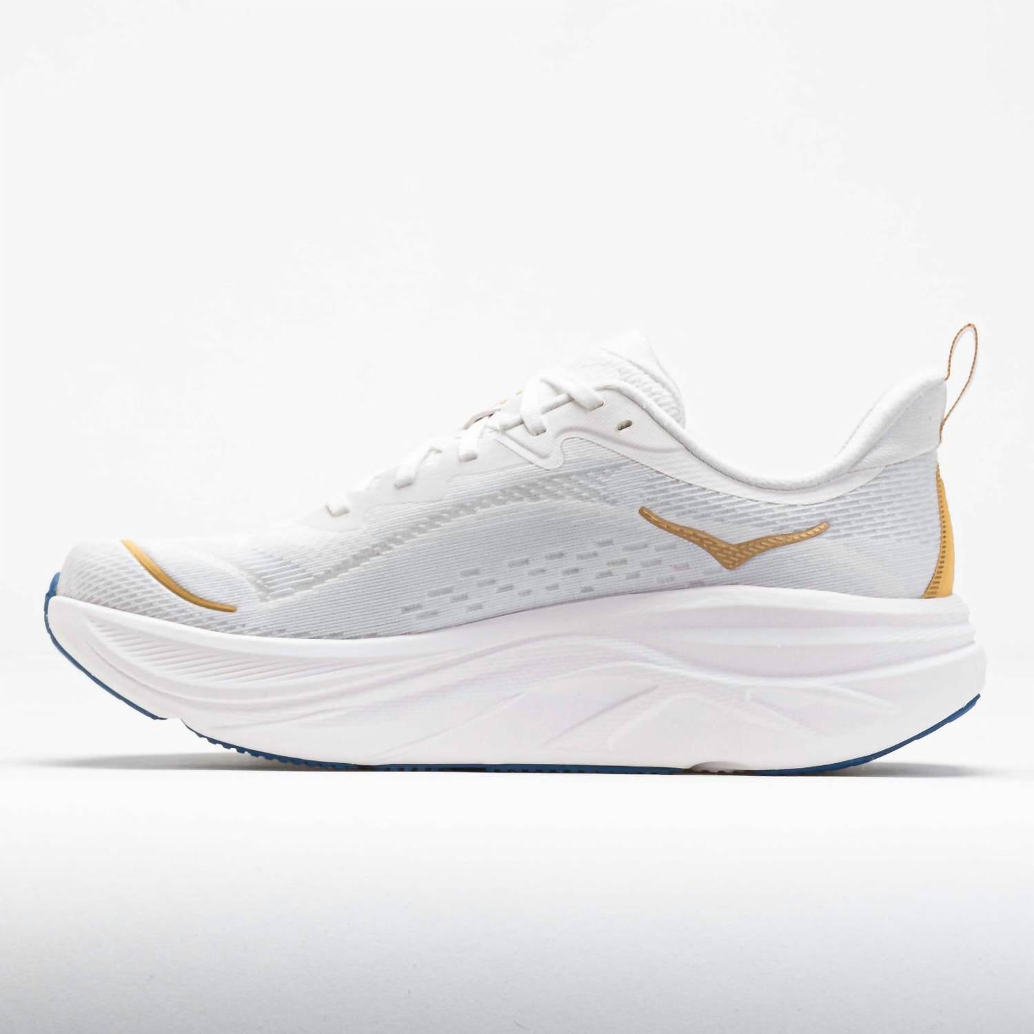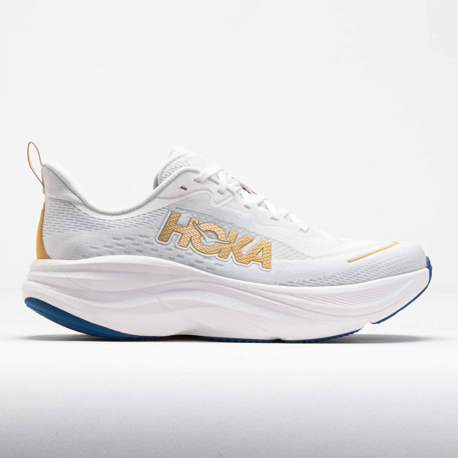 Step into your athletic journey with the Hoka Men's Skyflow Running Shoes in a striking Frost/Gold color. Crafted with a creel jacquard upper, these shoes ensure a soft step-in feel and a secure, stable fit. The super-critical EVA foam midsole offers a soft and energetic ride, while the high-abrasion rubber outsole adds durability for daily mileage. Featuring a flat heel and a round toe shape, these shoes are perfect for athleisure trends and fitness workouts. Made for adults with an emphasis on smooth transitions and secure fit.