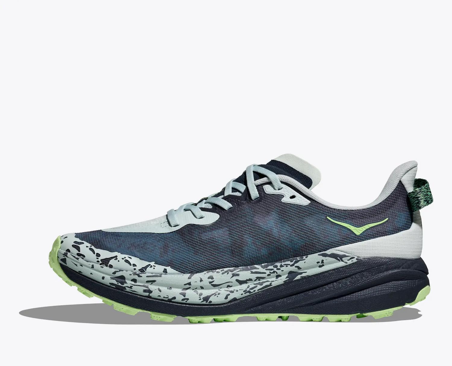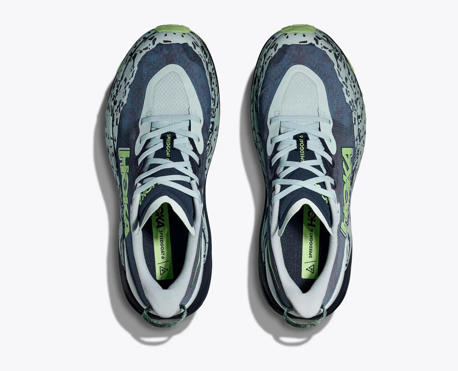 Workout in style with these adorable athletic sneakers. Experience the ultimate trail running with the Hoka Men's Speedgoat 6 Running Shoes, designed for a grippy and responsive ride on technical terrain. Crafted with a breathable woven textile upper, these shoes provide a secure fit with an internal support chassis and dual-sided gusseted tongue. The Vibram® Megagrip with revised lug orientation offers enhanced traction, and the 5mm lugs ensure stability. Weighing just 278g with a 5mm heel-to-toe drop, they are perfect for summer athleisure and fitness workouts.
