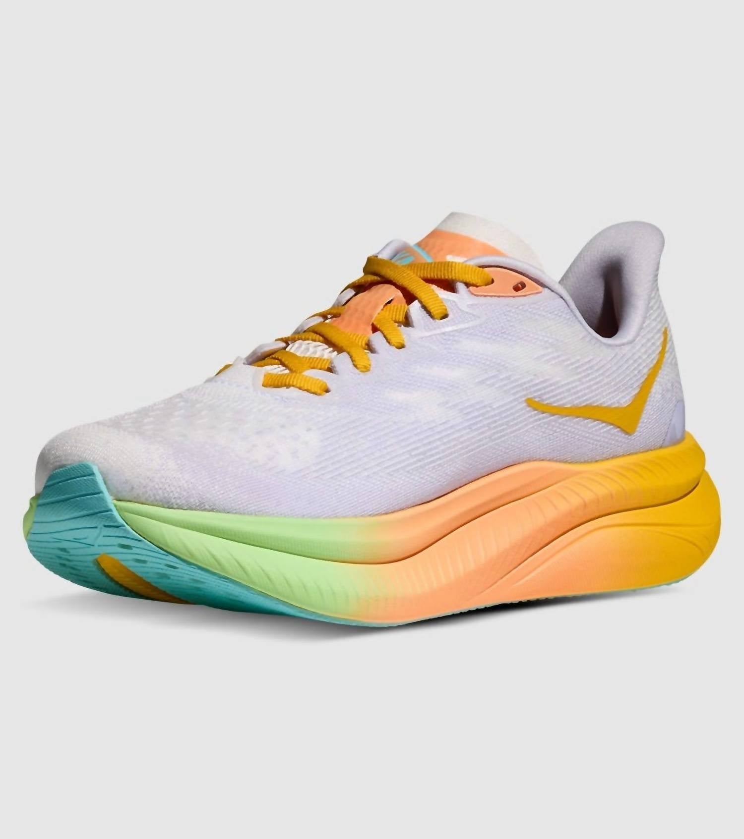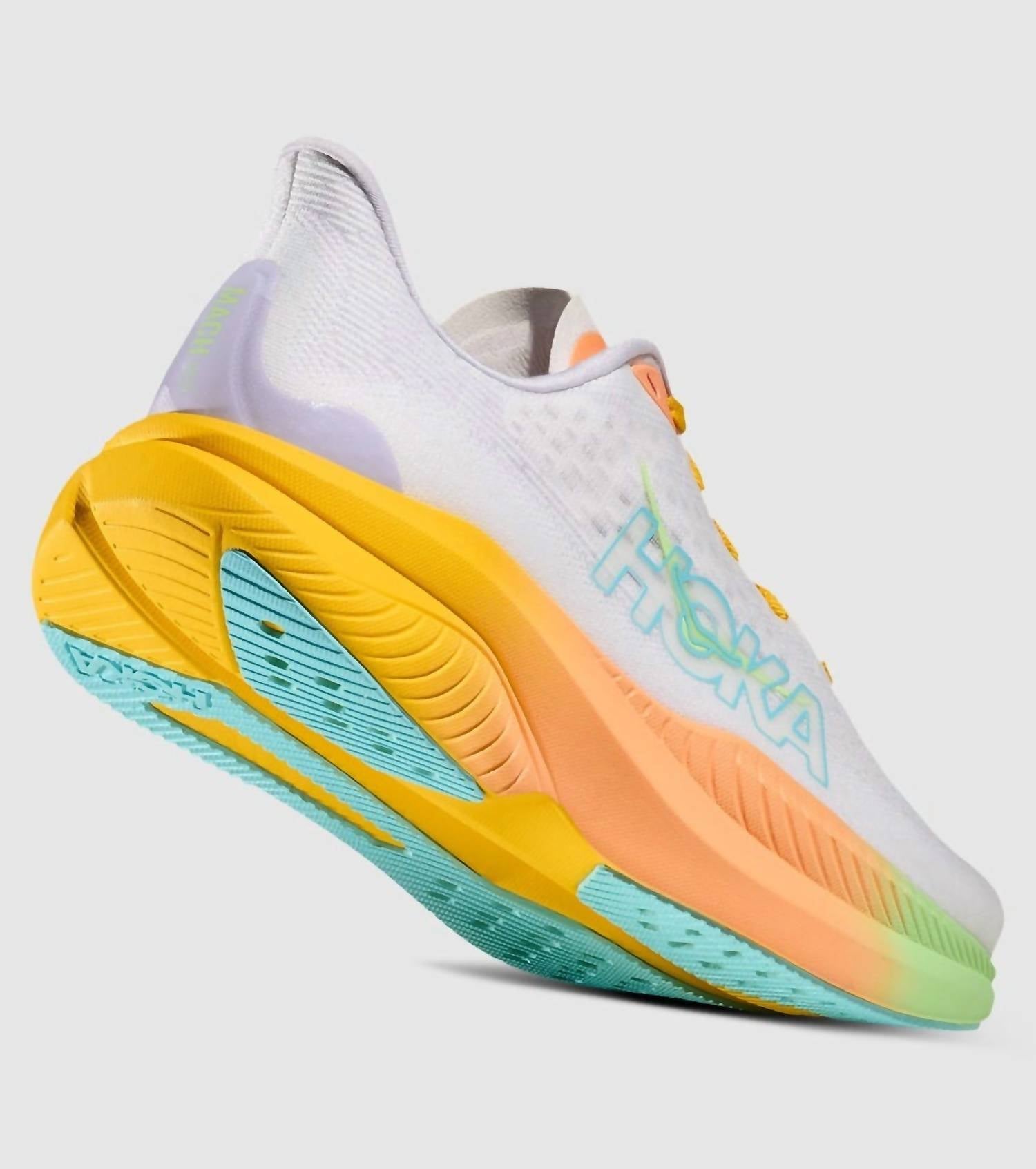 Workout in style with these adorable athletic sneakers. Introducing the Women's Mach 6 Running Shoes by Hoka, an exceptional pair designed for performance and style in a sleek Frost Starlight Glow hue. These athletic shoes are crafted with a revolutionary super critical foam midsole that ensures unparalleled energy return, complemented by strategic rubber coverage for increased durability. The innovative creel jacquard upper features zonal breathability and an internal gusset, providing a snug fit and foot-hugging comfort ideal for chasing personal records. With a flat heel under 1", these round-toe shoes are perfect for fitness workouts, athleisure trends, and spring activities, making them an ideal choice for the 4th of July celebrations.