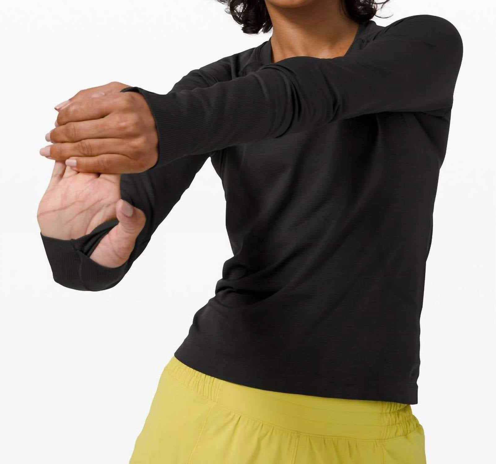 A long sleeve top you can wear with denim, skirts, well... just about anything! Introducing the Swiftly Tech Long Sleeve 2.0 by lululemon, a high-performance piece in sleek black designed for the active woman. This long sleeve top is crafted with seamless construction for reduced chafing and features a crewneck, slim fit, and race length, ensuring it stays in place during intense workouts. Tailored for running with Silverescent® technology to inhibit odor, it promises freshness and comfort. Closure: Pull on. Care: Machine wash and line dry.