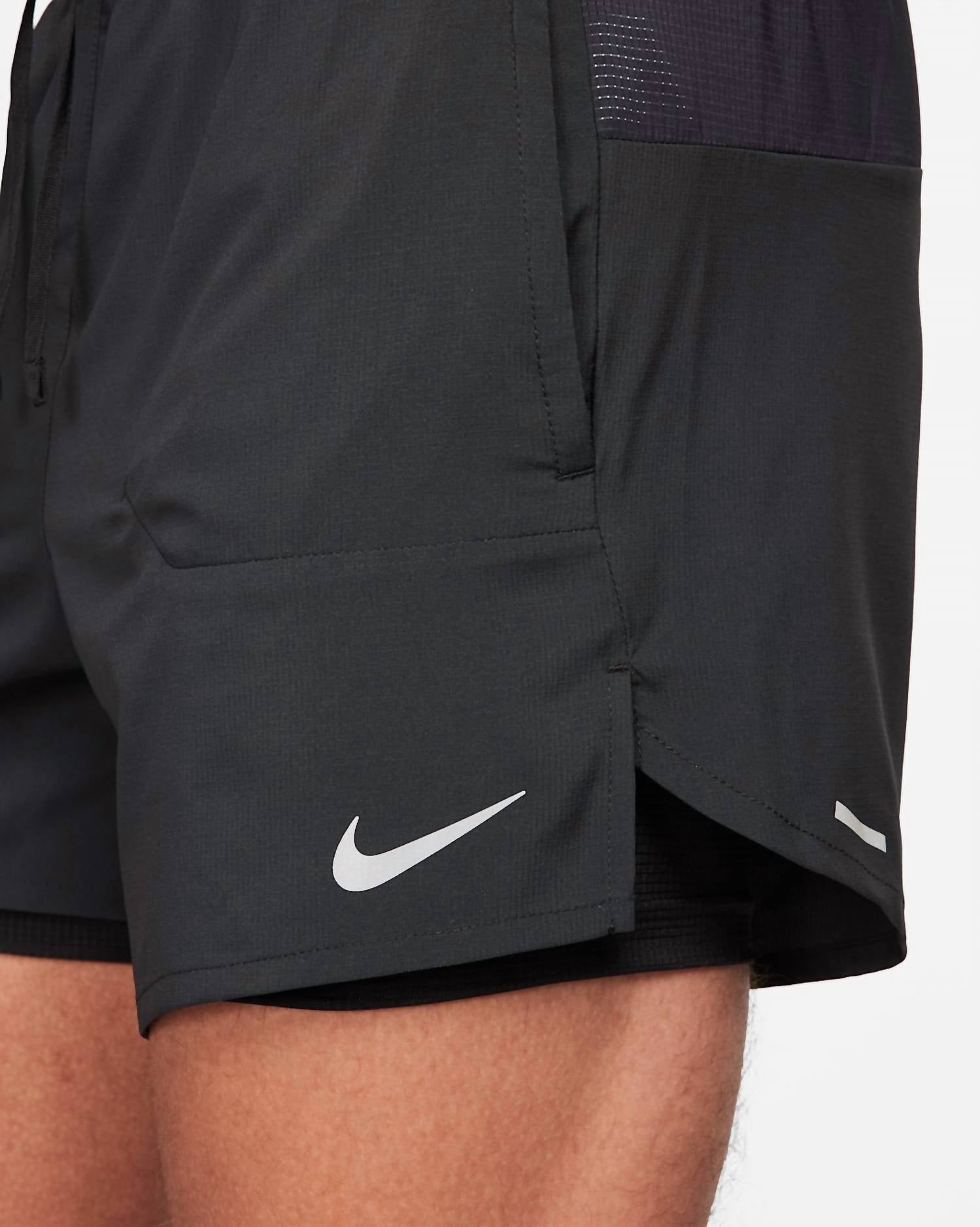 Elevate your running experience with the Nike Dri-FIT 5" 2-in-1 Running Shorts in Black/Reflective Silver, designed specifically for men. These athletic shorts feature a lightweight and breathable woven fabric, complete with an outer short length of 5 inches and a supportive 7-inch inner short liner. Composed primarily of polyester and spandex, these shorts offer a pull-on closure with a narrow waistband drawcord for a secure fit, while the zippered back pocket and side pockets provide ample storage for your phone and other valuables. Care is simple with machine washing—enhance your summer athleisure collection with this essential running piece.