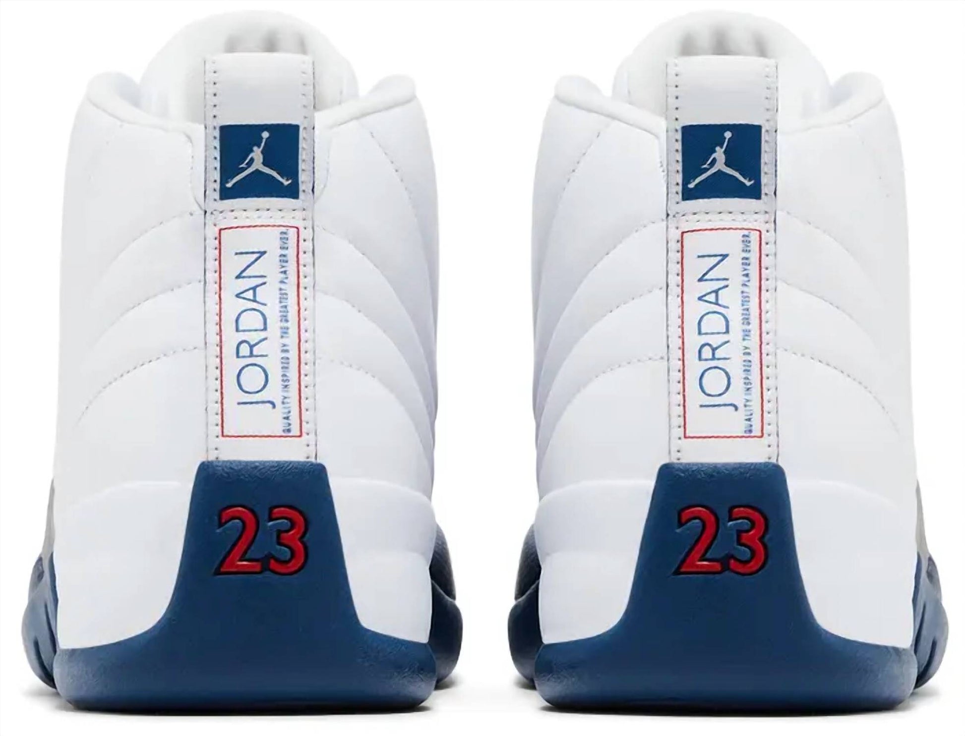 The 2025 edition of the Air Jordan 12 Retro 'French Blue' revives a 2004 release, featuring a white tumbled leather upper with radiating stitch lines and a blue lizard-textured overlay. Jumpman branding adorns the tongue and heel loop. The Phylon midsole packs a full-length Zoom Air unit for responsive cushioning. Underfoot, the blue rubber outsole features herringbone traction pods and an exposed carbon fiber shank.