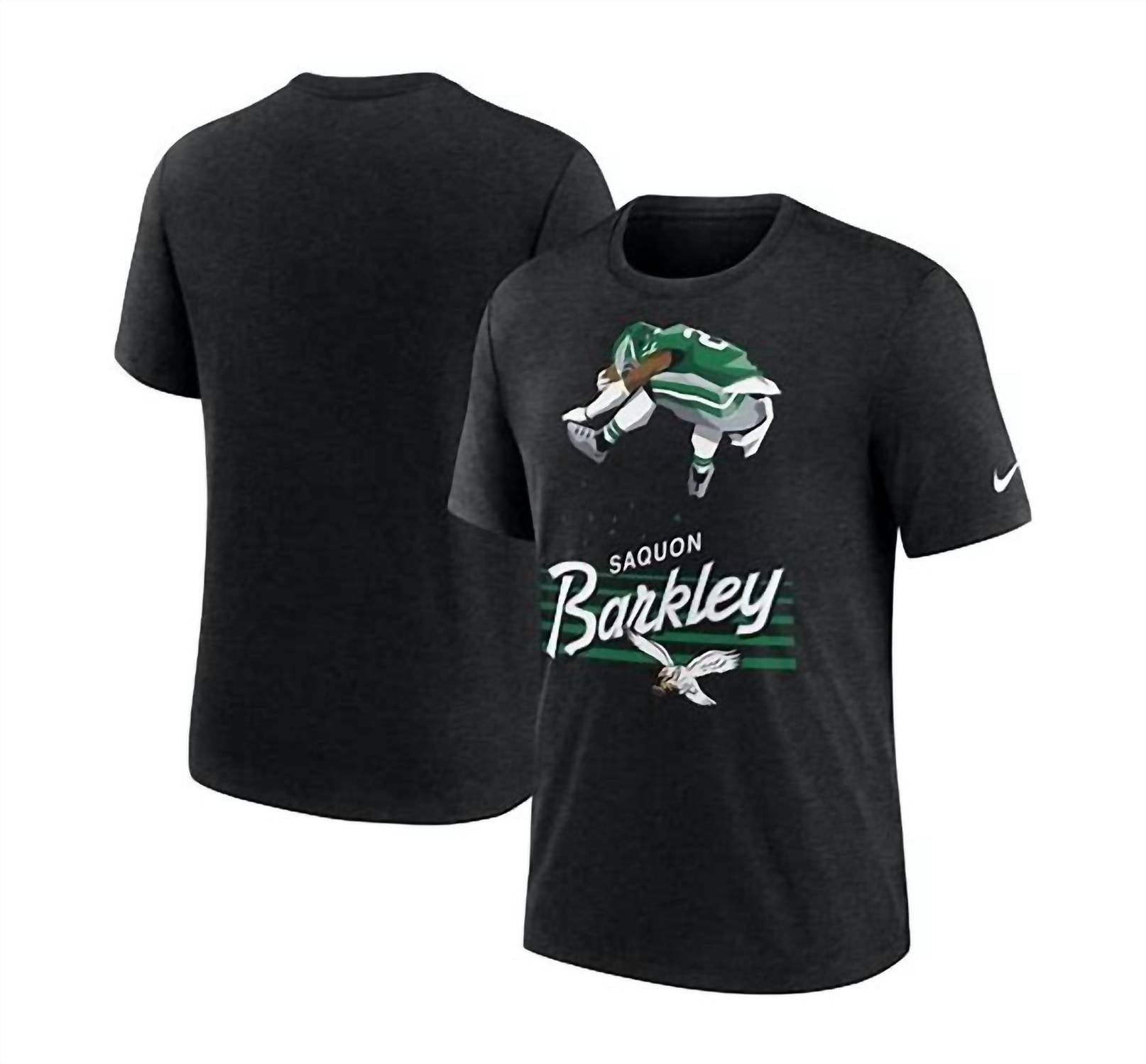 Show your unwavering support for one of the NFL's brightest stars with this Saquon Barkley Player Graphic T-Shirt from Nike. With a classic fit that's not too loose or tight, this tee ensures all-day comfort whether you're at the game or spending a day around town. The vibrant Saquon Barkley graphic printed on the front makes a stylish statement, showing your pride in the Philadelphia Eagles and one of the faces of their franchise. Product Details Product ID: 2001507148 Brand: Nike Imported Classic Fit: Not too loose or tight across the chest, shoulders and waist Player graphic printed on front Rib knit collar Material: 50% Polyester/25% Cotton/25% Rayon Short sleeve Machine wash, tumble dry low Screen print graphics Officially licensed Crew neck
