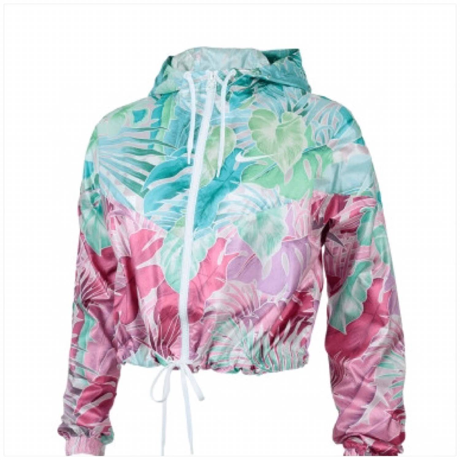 This utility jacket is the perfect combination of cool and feminine. When warm weather arrives, this playful zip-up jacket is the perfect match. Designed with iconic chevron lines inspired by classic athletic styles, it features a shiny woven fabric, a lightweight feel, and a vibrant tropical-print finish. The cropped length sits above the hips for a modern touch, while side pockets, elastic cuffs, and an adjustable drawcord hem and hood enhance comfort and functionality. Made from 100% polyester with a loose, oversized fit, it’s your go-to layer for effortless warm-weather style.