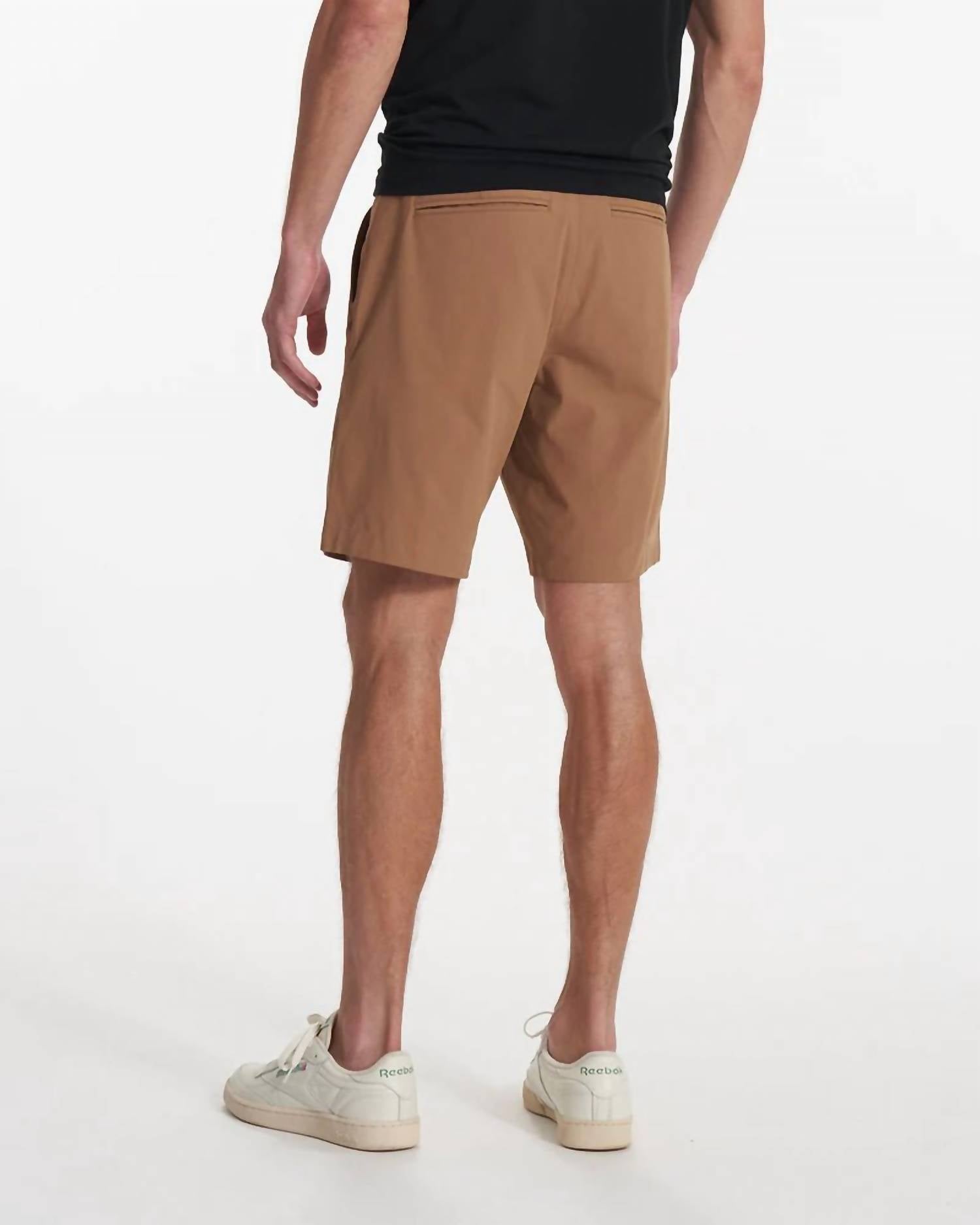 Introducing the Meta Quick Drying Short by Vuori, a perfect blend of style and functionality in a classic Carmel solid color. These men's hybrid shorts feature a pull-on closure, crafted from stretchable nylon material, ideal for a dynamic lifestyle. With a practical 8-inch inseam, they boast moisture-wicking, quick-drying properties, making them perfect for vacation and summer activities. Plus, they're machine washable and can be tumble dried, offering convenience for everyday wear.