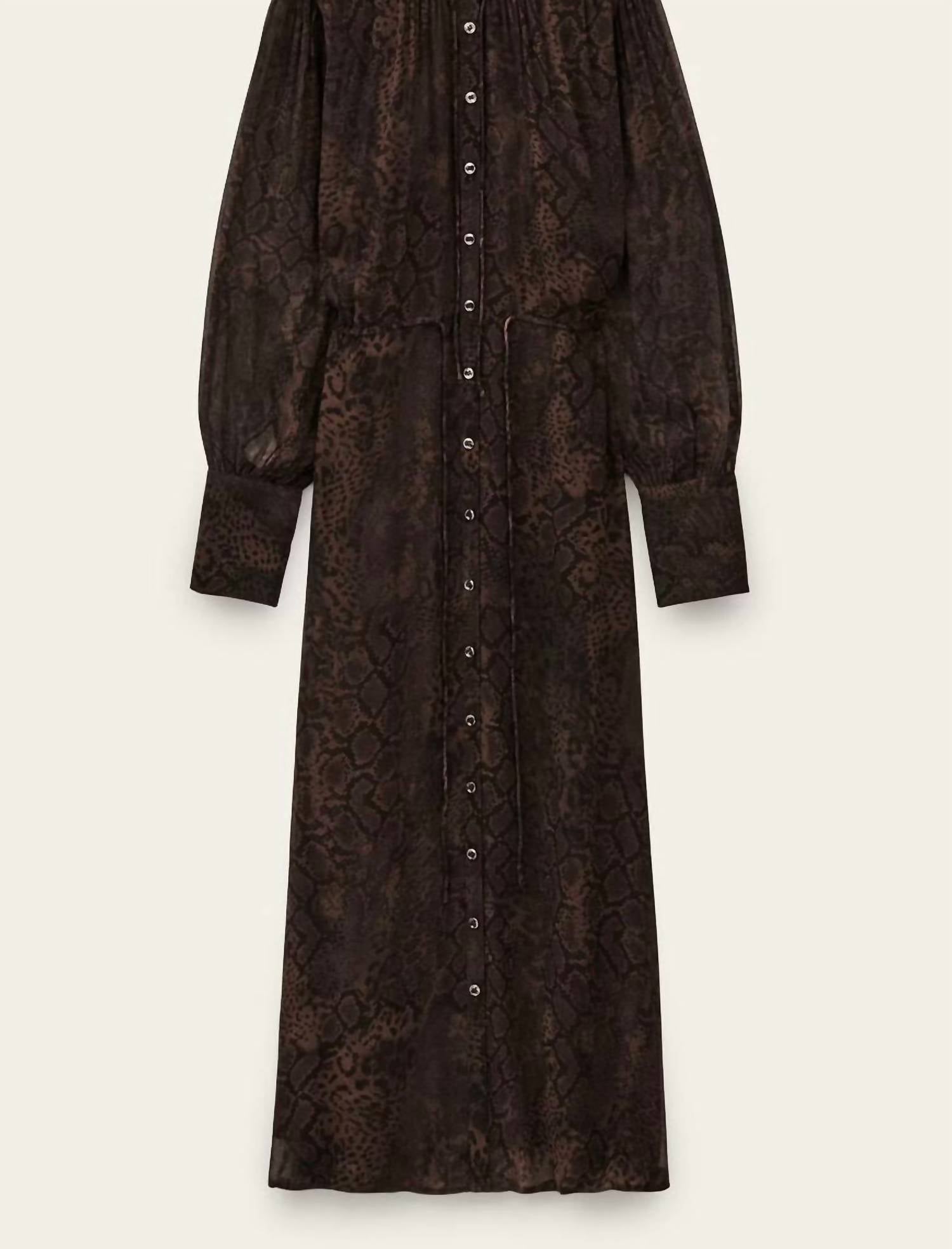 Style this maxi with your favorite statement necklace and sandals for the perfect look. Introducing the Ba&sh Sahara Maxi Dress, a captivating addition to your wardrobe with its A-line silhouette and V-neck design. This Marron maxi dress features long sleeves with a semi-sheer touch adorned in an eye-catching snakeskin print. Crafted from 100% viscose, it closes with buttons and is perfect for vacation or any maximalist style statements. Care for it by dry cleaning to maintain its elegance.