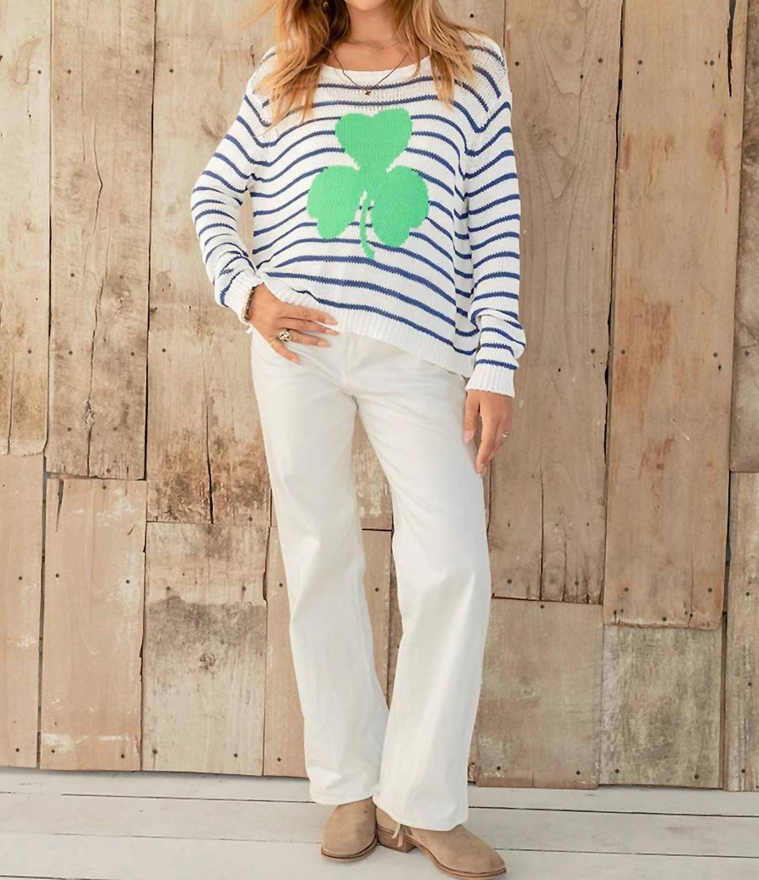 Fit to perfection and effortlessly chic. Discover the Shamrock Striped Crew Sweater by Wooden Ships, a harmonious blend of style and comfort in a sophisticated White and Indigo palette. This women's long sleeve sweater features a chic French-inspired stripe pattern and a unique clover leaf graphic seamlessly integrated into the design. With its slouchy fit, this cotton blend piece, composed of 60% cotton and 40% acrylic, promises unmatched softness and lightweight wear. Made with a pull-on closure and thoughtfully finished with ribbed accents, it’s easy to maintain with machine wash on delicate.