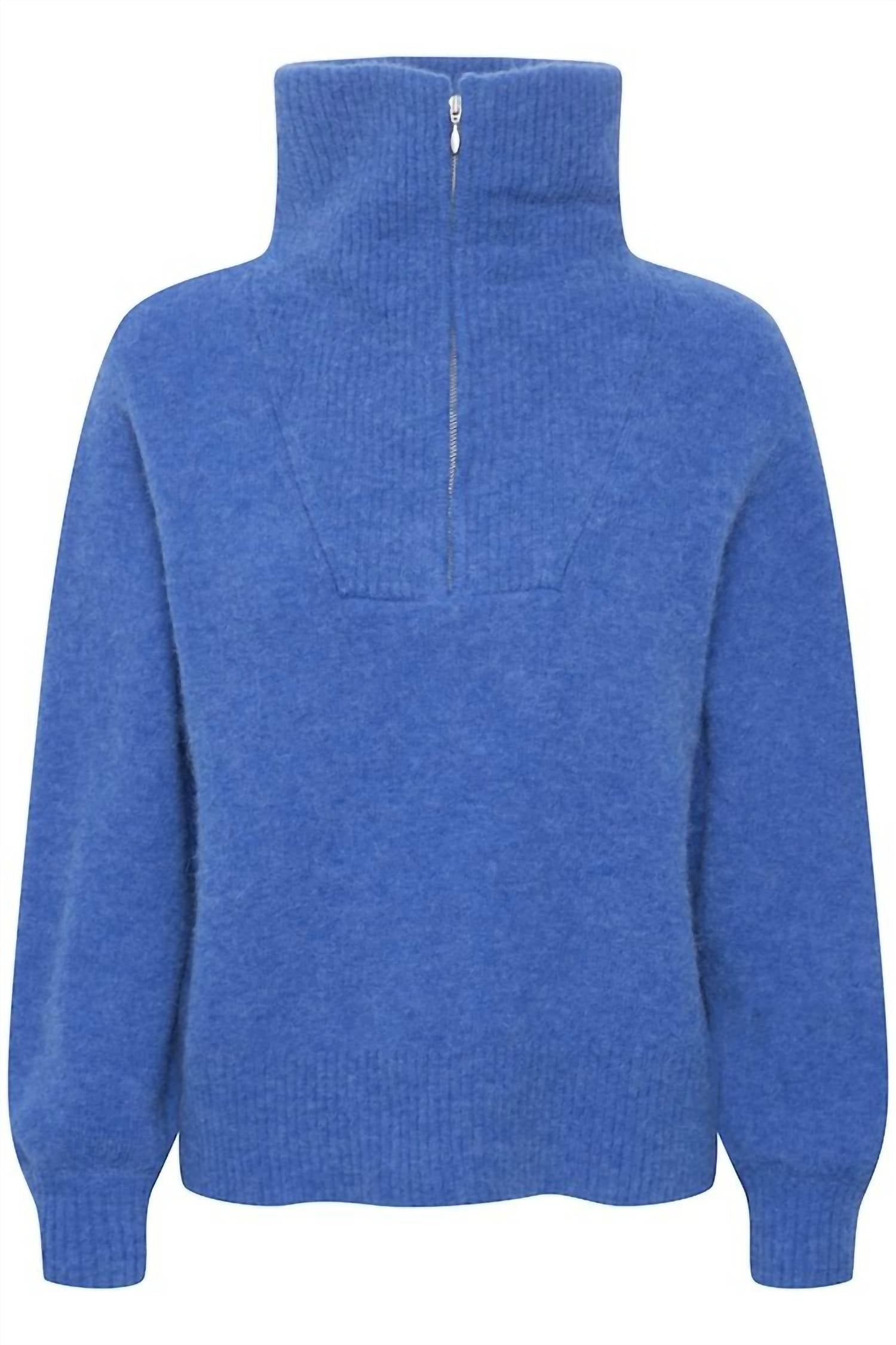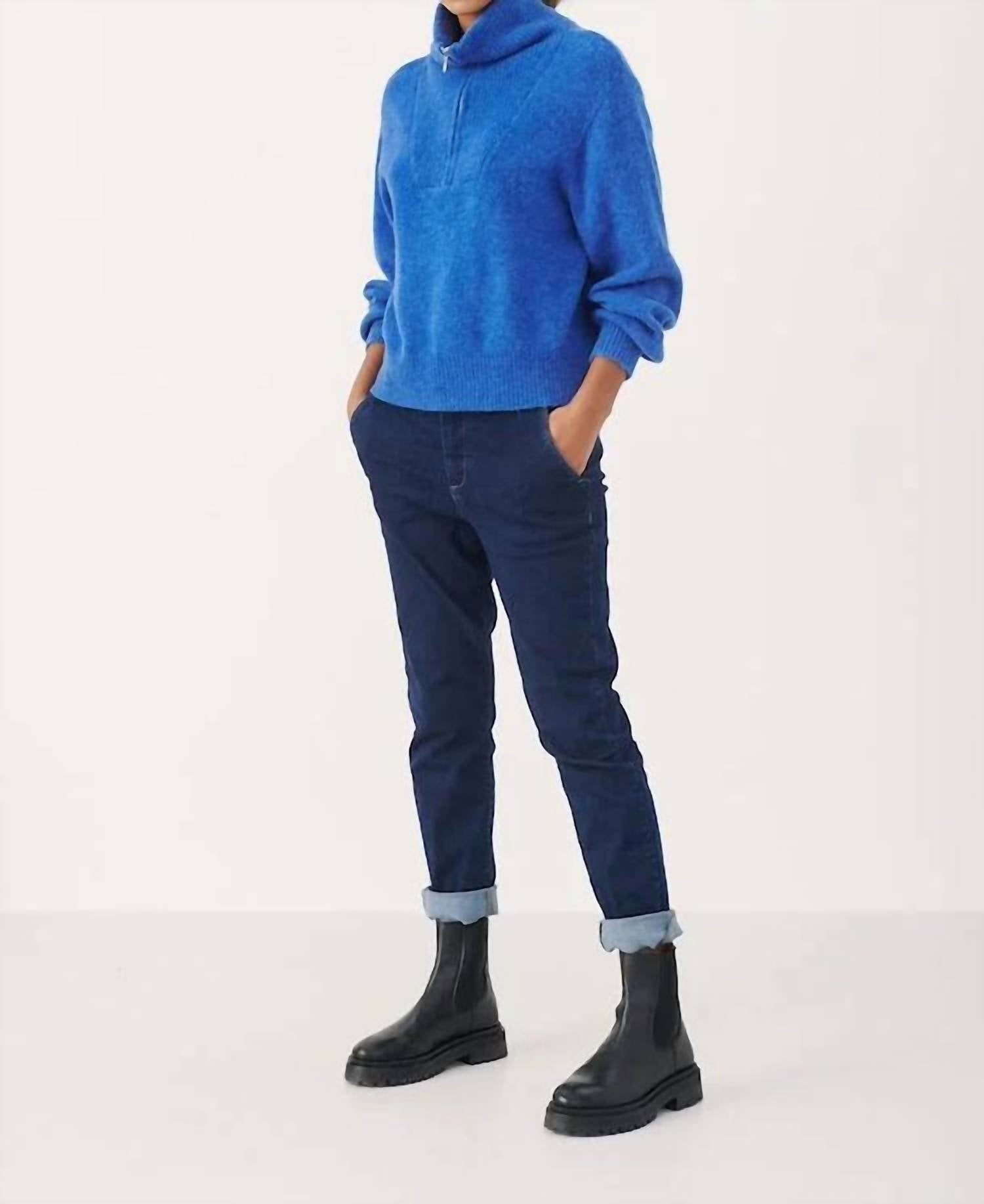 Fit to perfection and effortlessly chic. Introducing the Raheen Zip Pullover by Part Two, a relaxed-fit sweater in Beaucoup Blue perfect for travel. This long-sleeve piece features a mockneck and wide spread zip collar, crafted from a responsibly sourced blend of 32% Alpaca, 32% Wool, 30% Recycled Nylon, and 6% Elastane. Achieving the perfect length, the garment measures 59 cm in size L. Care instructions are specific: hand wash only, avoid bleach, iron at a maximum of 110°C, do not tumble dry, and dry clean only.