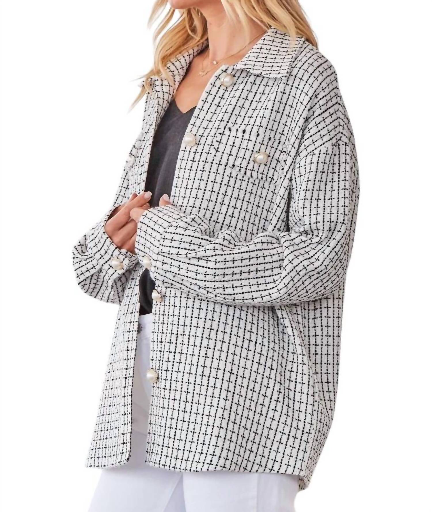This tweed shacket features an oversized fit, long sleeves, a collared design, and button closure. It is made from 100% polyester.