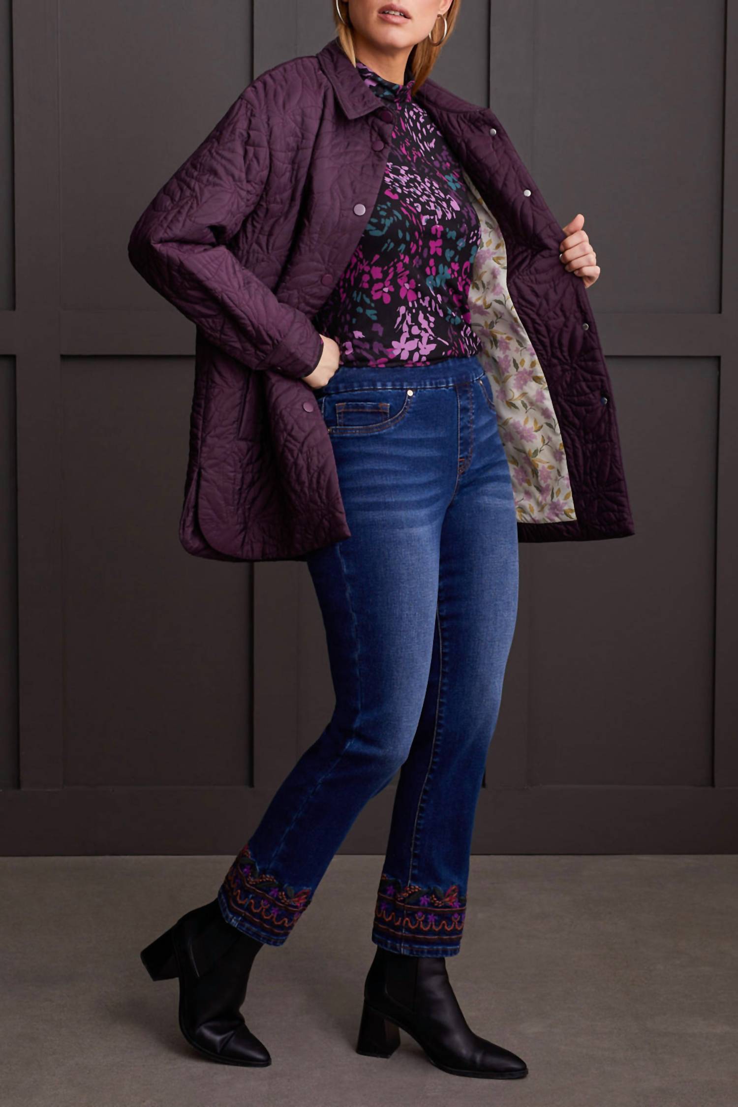 Cute, casual, and comfortable. This jacket is a must have. Introducing the Quilted Snapped Front Shacket by TRIBAL, a stylish addition to your wardrobe in a rich Raisin shade. This women's casual jacket features long sleeves with a drop shoulder design and a comfortable 30" length. Crafted for the fall season, it includes a quilted and textured pattern complemented by a button closure and a collared neckline for a polished look. The jacket is machine washable, ensuring easy maintenance, and comes with practical welt pockets and a charming patterned lining for added elegance.