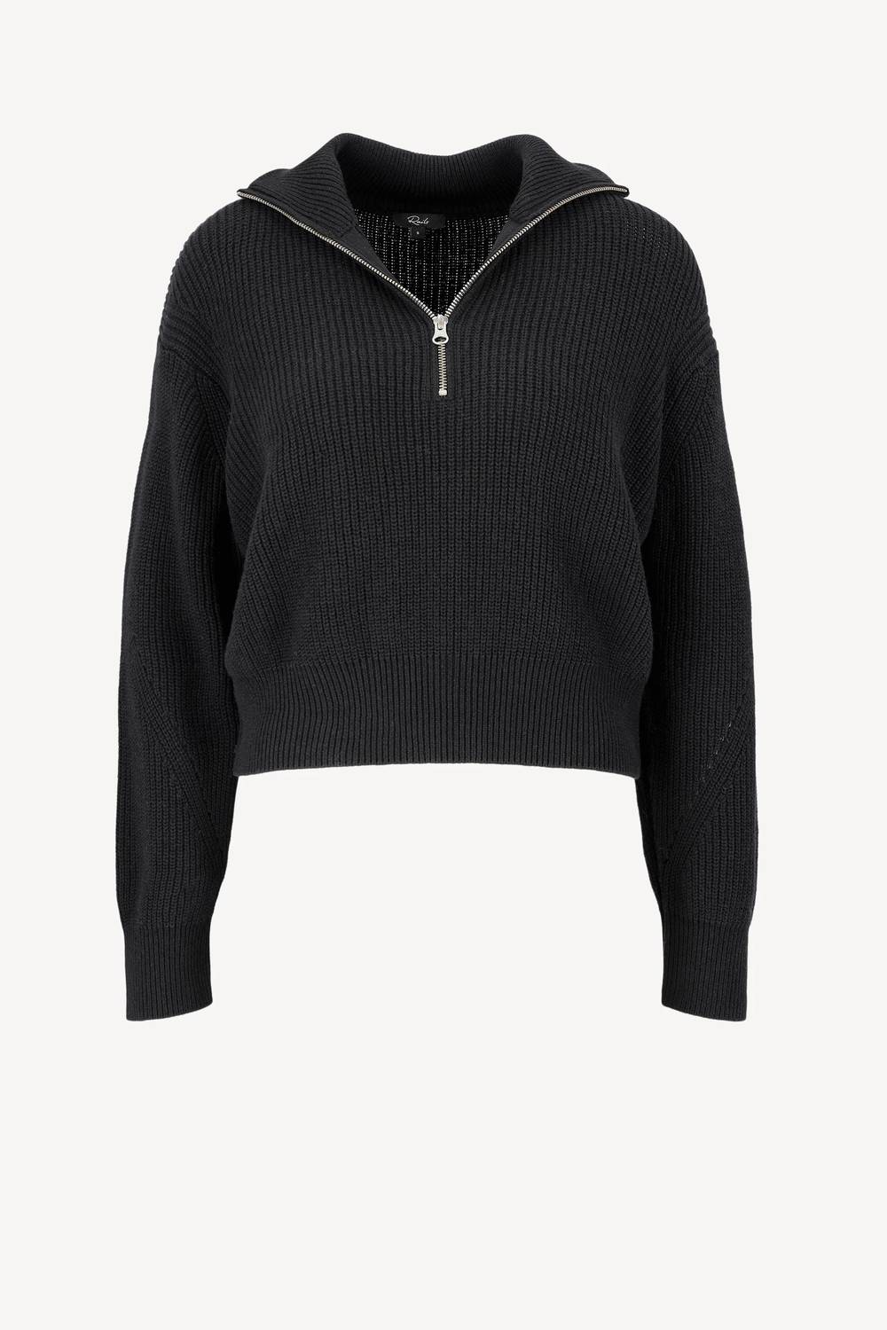 Long sleeves. Half zip. Can turn into turtle neck. Knitted. No pockets.