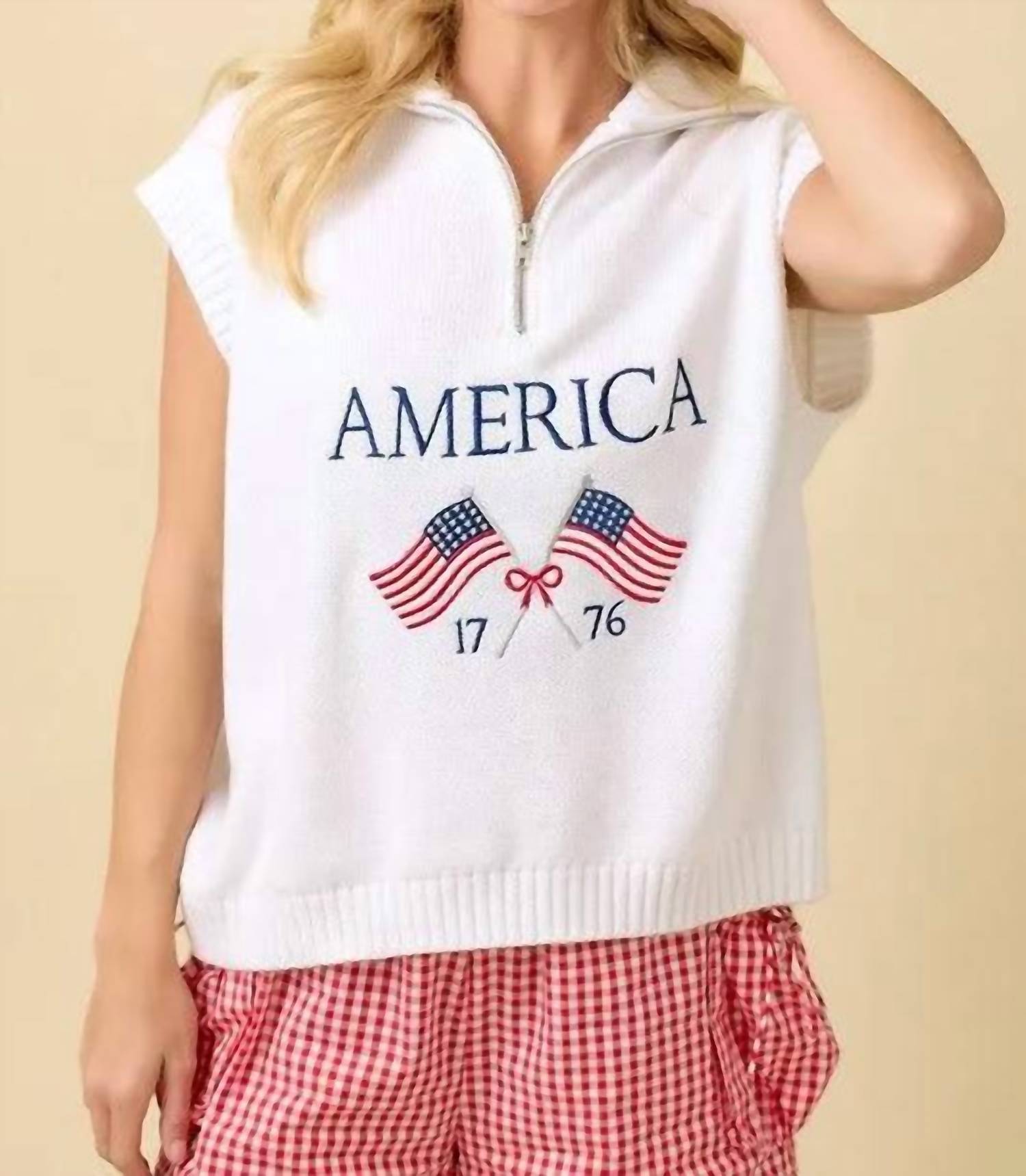 A classic staple that every closet needs. This sleeveless half zip knit top features an embroidered American flag detail. Show off your patriotic spirit in style with this fun, easy to wear fashion piece.