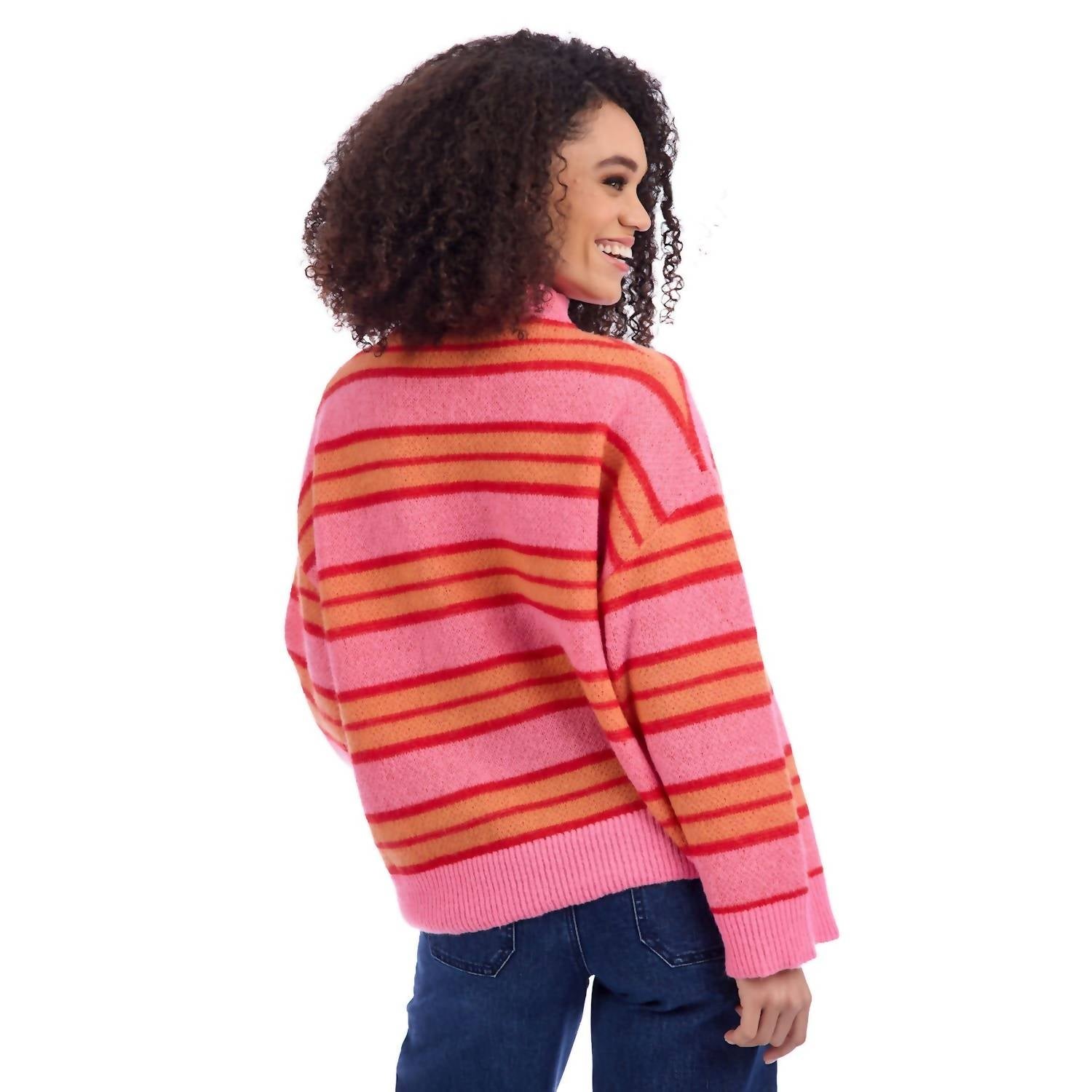 Fit to perfection and effortlessly chic. Introducing the Quinnie Turtleneck Sweater by Mudpie, a playful addition to your winter wardrobe. This pink jacquard sweater features long sleeves with ribbed cuffs and a trendy cropped hem, perfect for a maximalist travel look. Made for easy wear with a convenient pull-on closure, it measures approximately 24" from shoulder to hem in a size small/medium. Elevate your style with this cozy turtleneck, ideal for layering with a fun twist.