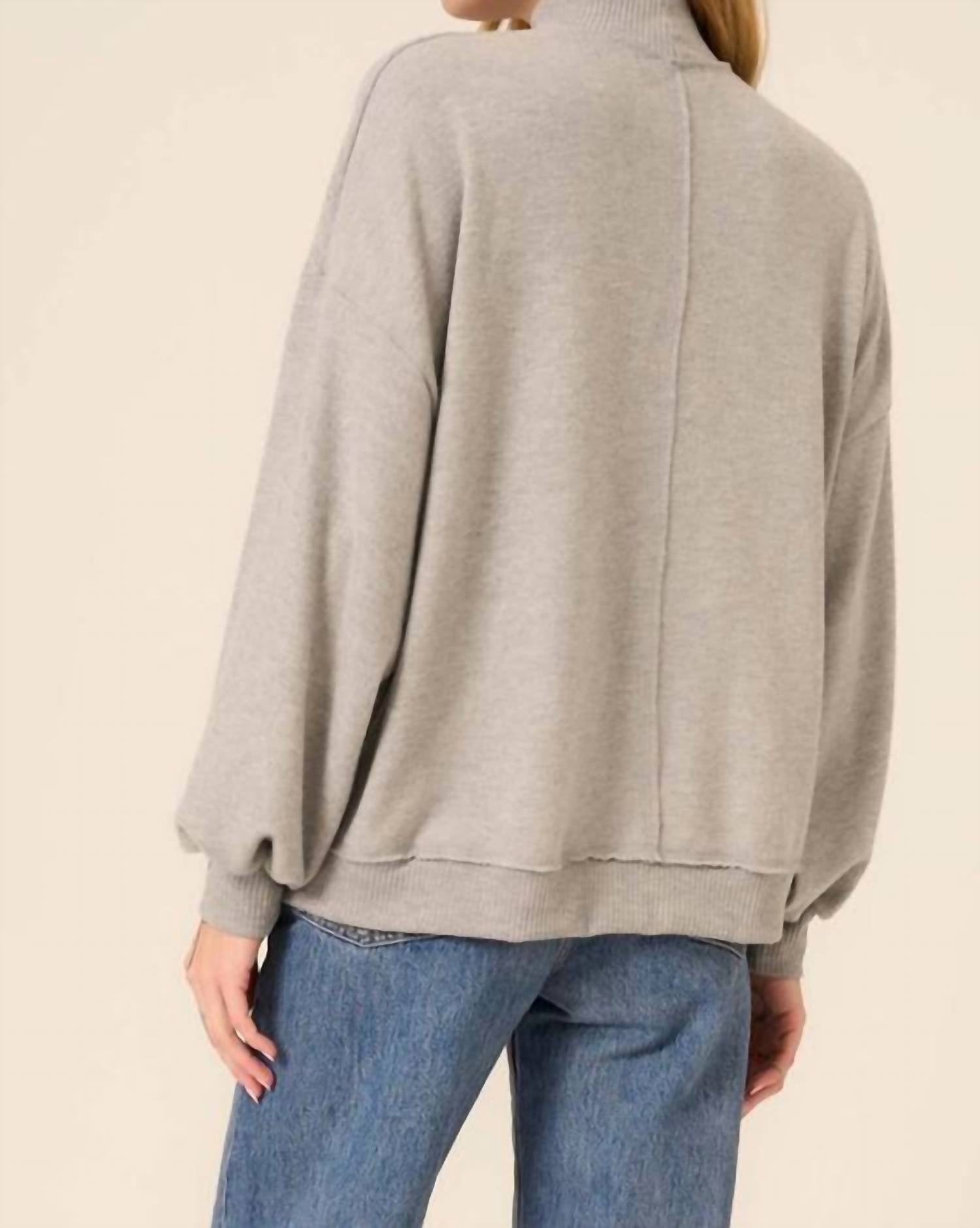 Fit to perfection and effortlessly chic. This heather grey staple features long sleeves, a mock neck, and a relaxed fit with drop shoulders and banded hemline. Designed in a soft, brushed heathered blend, it's crafted from 48% Polyester, 48% Rayon, and 4% Spandex. Closure: Pull on. Garment length: 24". Care: Machine wash and lay flat to dry.