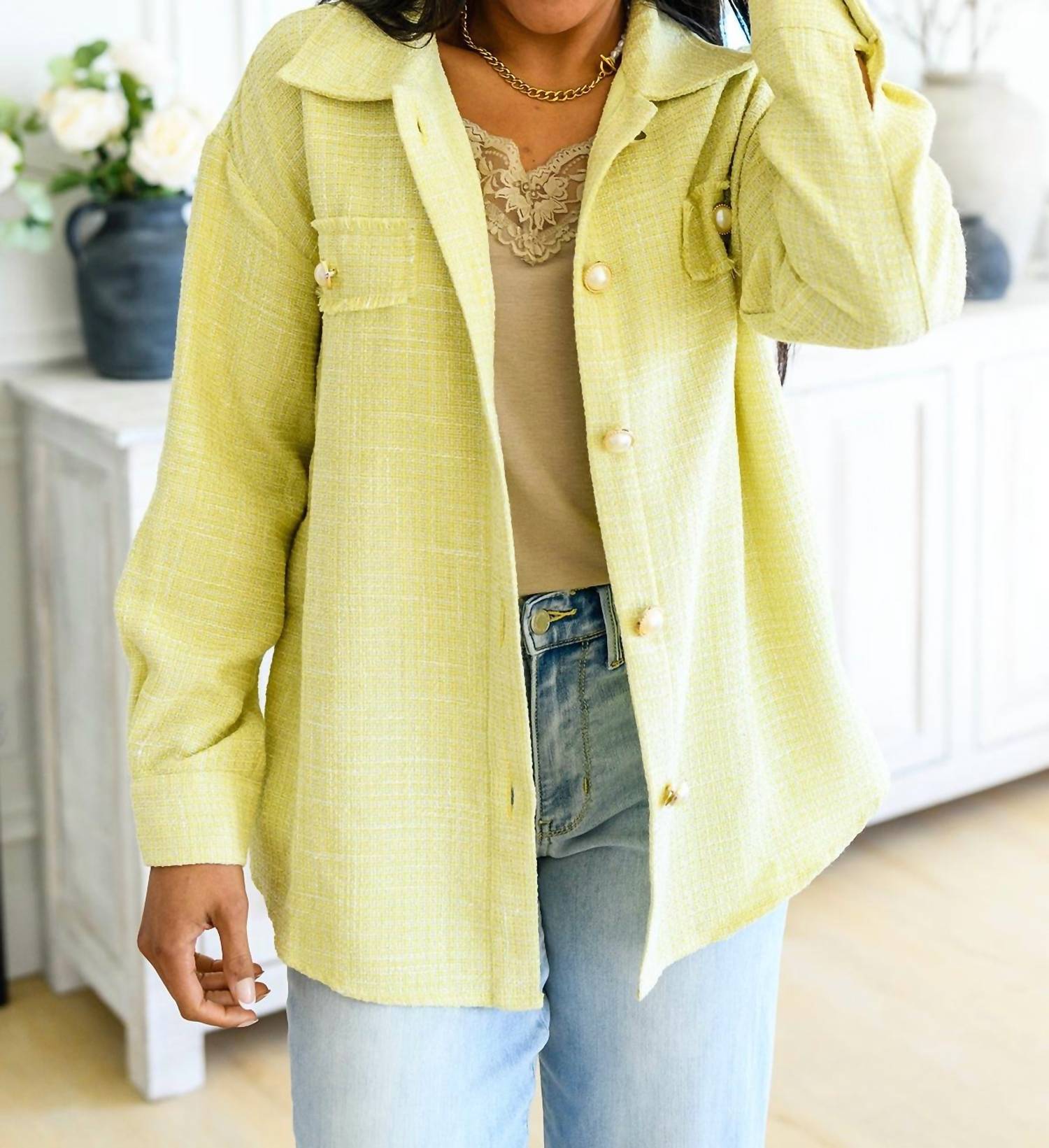 This utility jacket is the perfect combination of cool and feminine. Discover the Daydreams Shacket by ANDREE BY UNIT, a must-have piece for your spring collection. This lightweight utility jacket is crafted from 100% woven polyester and features long sleeves and a classic collared neckline. It boasts a stylish button closure with faux pearl buttons, front decorative flap pockets, and a relaxed silhouette. Available in a vibrant yellow, this shacket offers a garment length of 27 inches and pairs perfectly with your favorite jeans or jumpsuit.