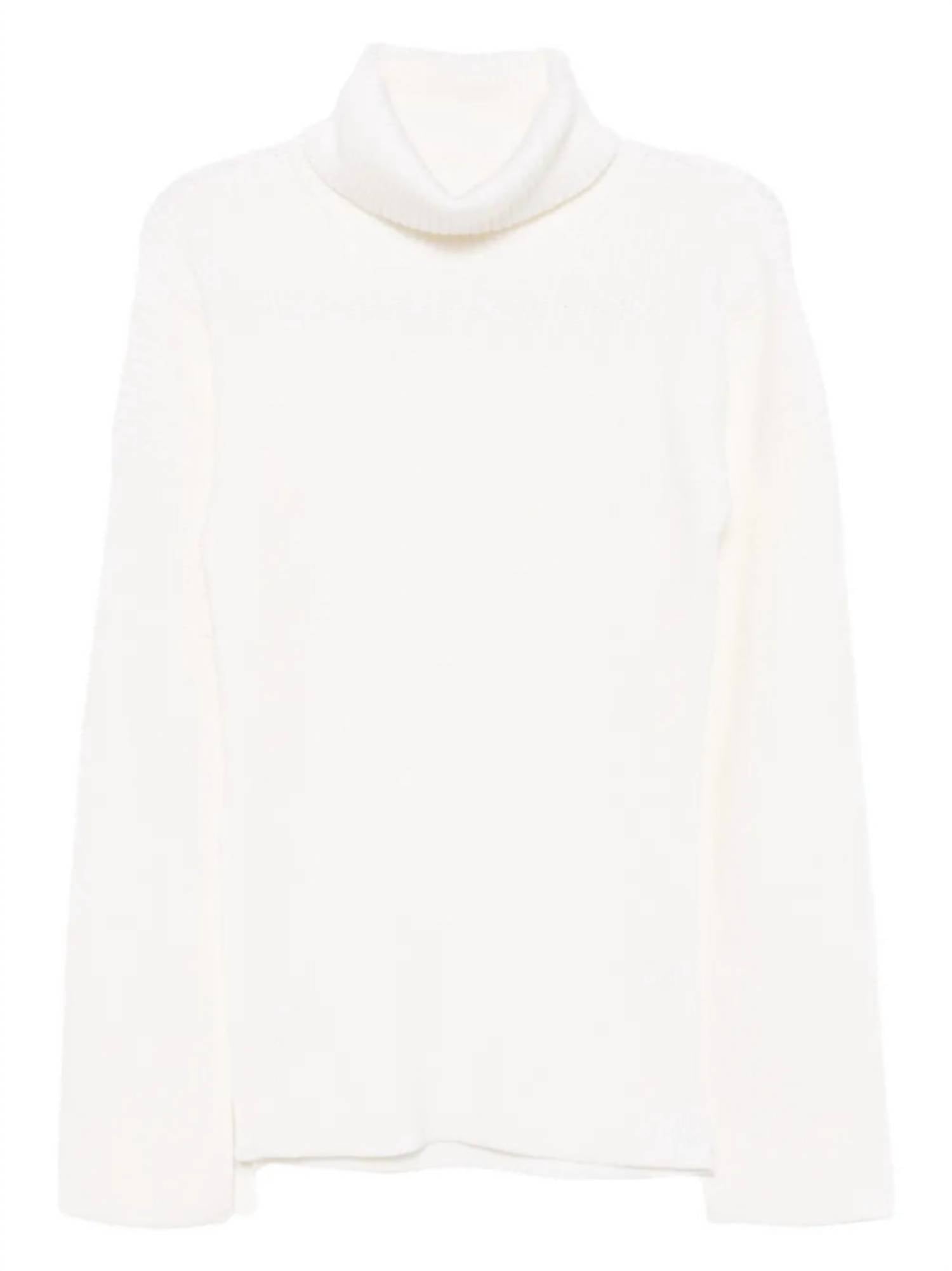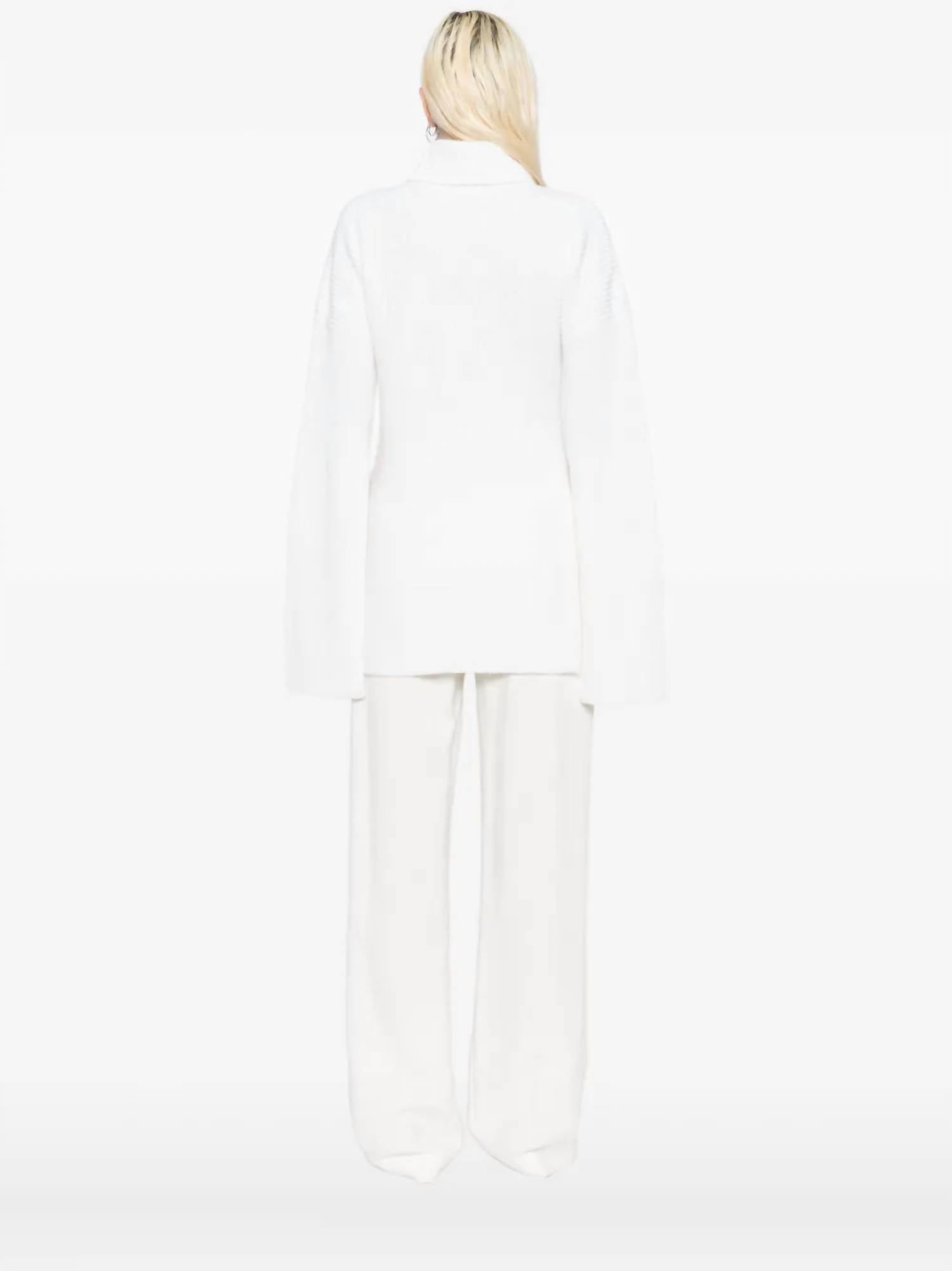 Fit to perfection and effortlessly chic. Elevate your winter wardrobe with the TOTEME Slit Sleeve Knit, a stylish turtleneck sweater in a sophisticated ecru hue. This piece features long sleeves with high slits, designed for seamless movement, and is rib-knitted from 100% mid-weight merino wool. The dropped shoulders add a modern touch to its slim silhouette, perfect for staying warm on those chilly summer nights. Imported for quality artisanship, this pull-on sweater is a must-have for any fashionable woman's collection.