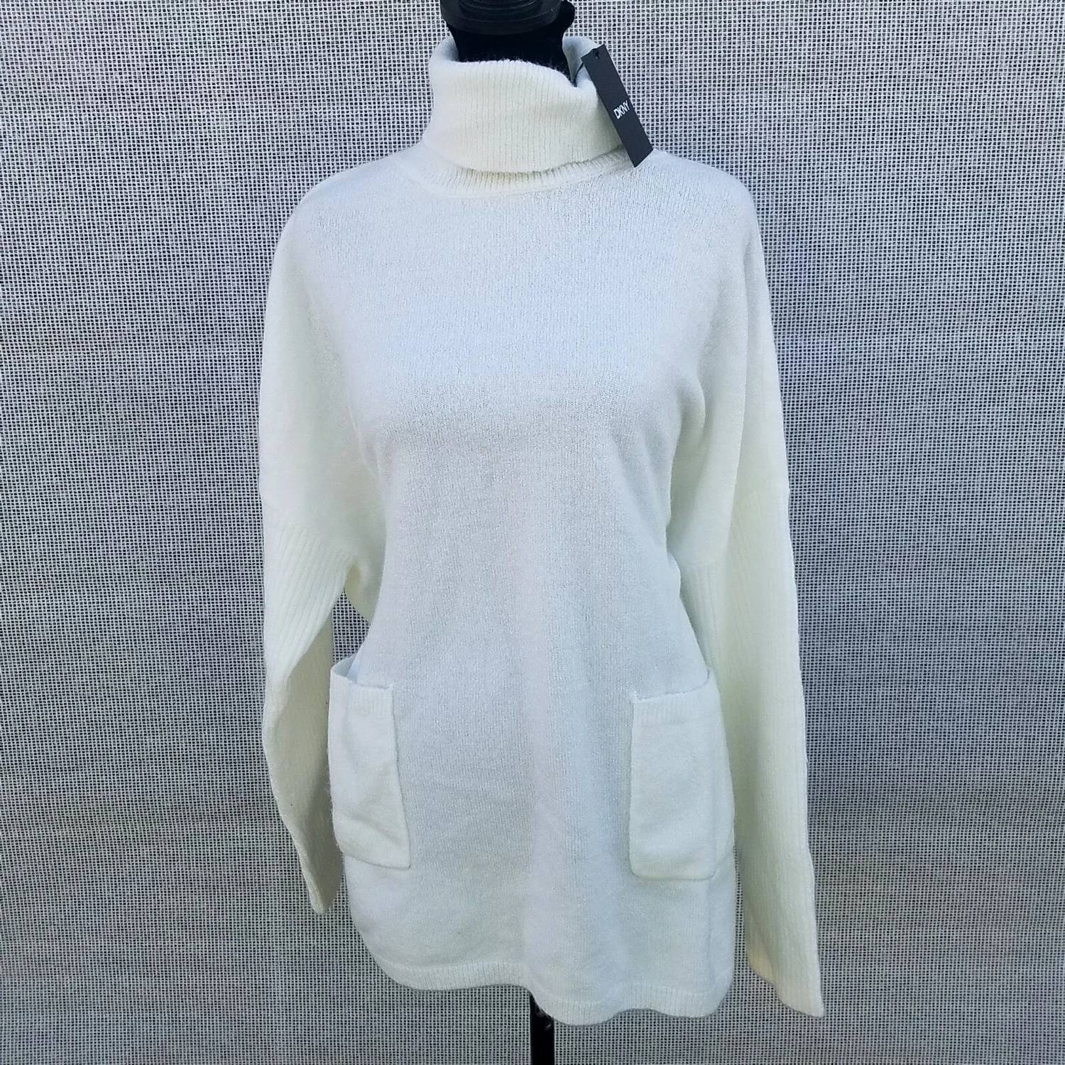 A classic staple that every closet needs. Introducing the DKNY Turtleneck Acrylic Blend Oversized Sweater in elegant ivory, perfect for cozy winter style. It features long sleeves and is composed of 68% Acrylic, 29% Polyester, and 3% Spandex/Elastane. This 27-inch garment offers patch front pockets and a convenient pull-on closure. Care for it with a simple hand wash and lay flat to dry.