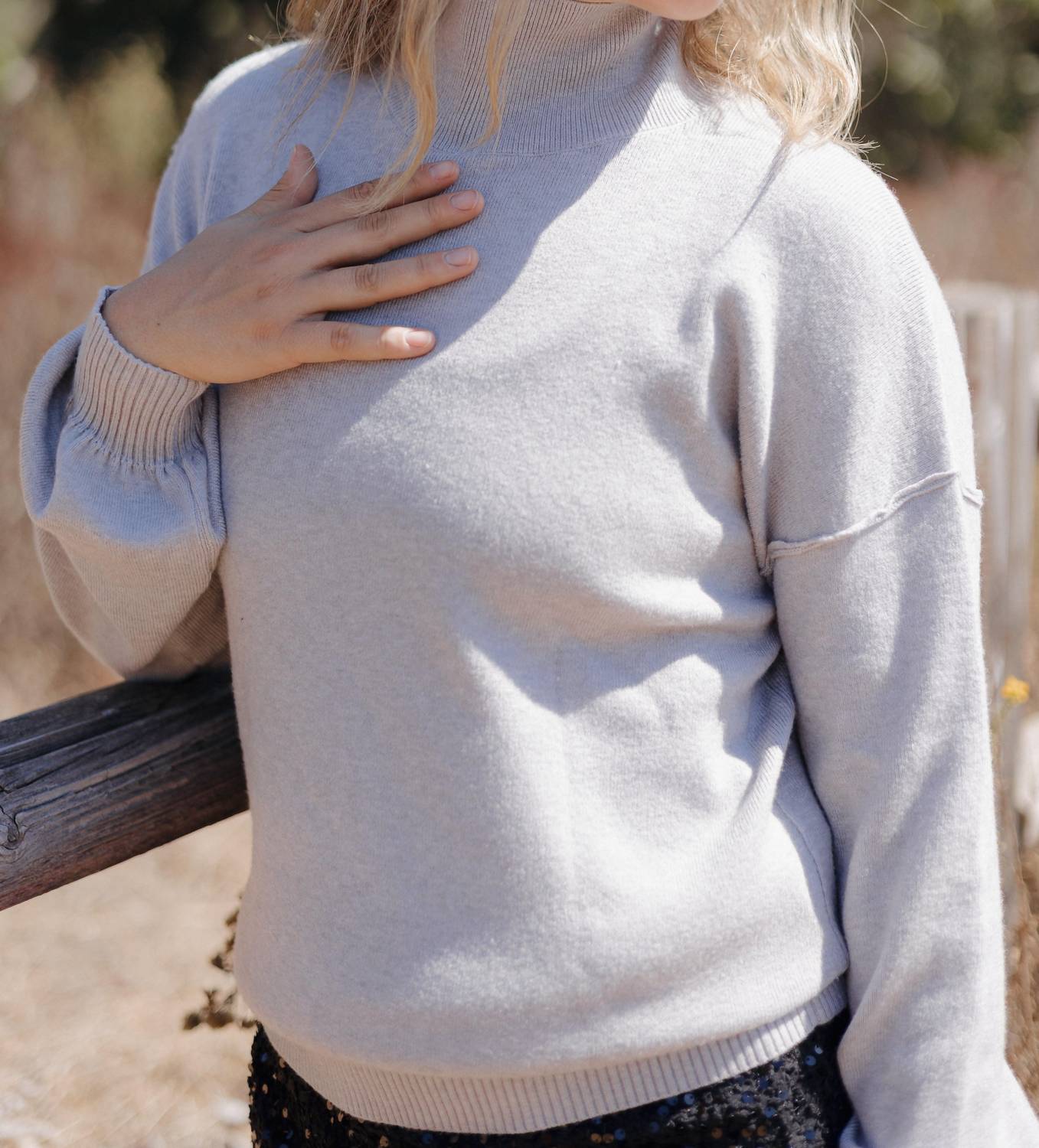Fit to perfection and effortlessly chic. Embrace the timeless fall fashion with the Brielle Turtle Neck Sweater by Threaded Pear. This women's sweater features long bubble sleeves and a relaxed fit, perfect for travel or Thanksgiving gatherings. The classic beige turtleneck design boasts a chic stripe pattern, adding a touch of preppy flair to your wardrobe. Closure: Pull-on style for easy wear. Model Jessie is wearing a size Small.