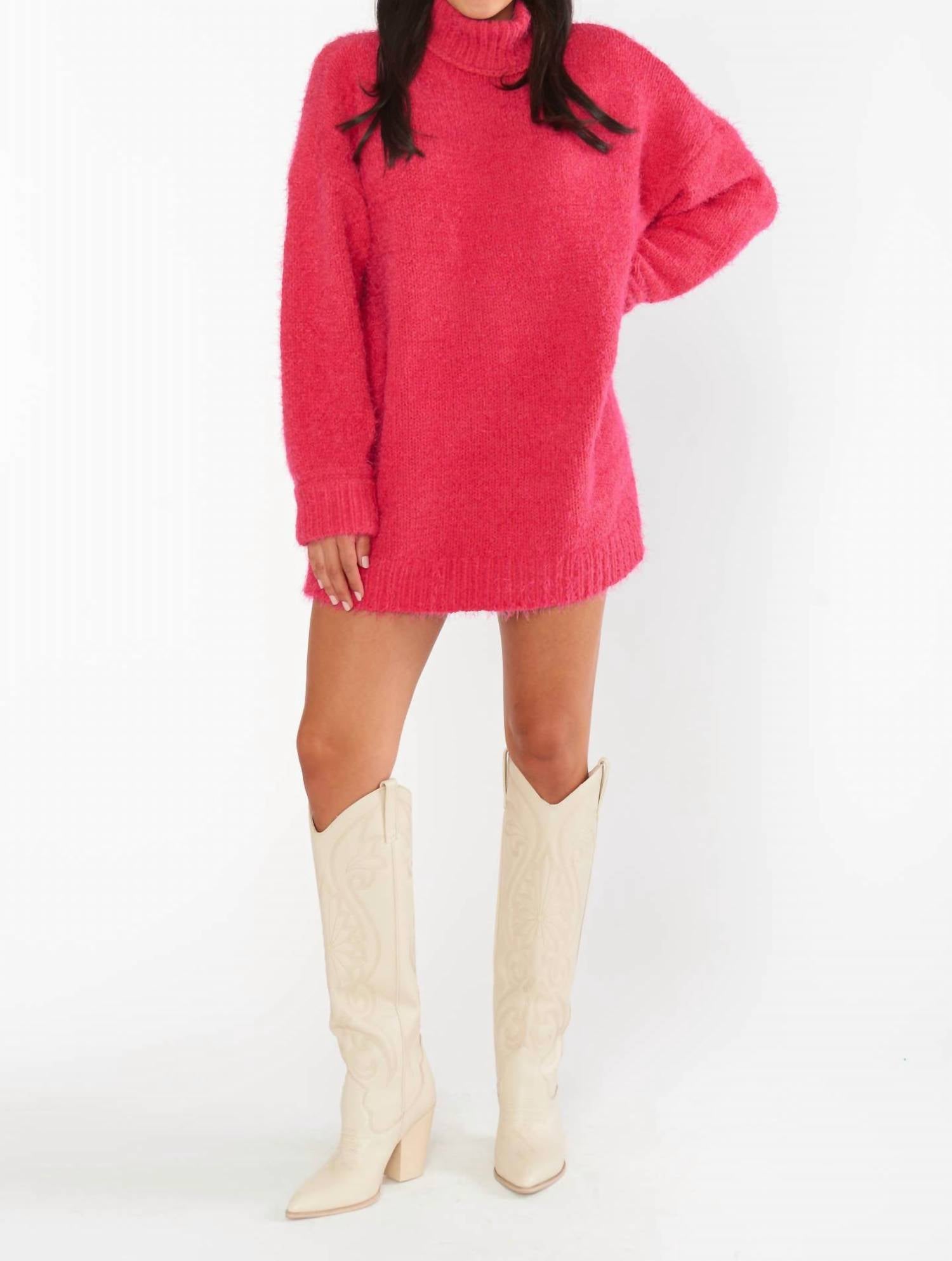 A classic staple that every closet needs. Introducing the Coziest Here Tunic Sweater by Show Me Your Mumu, a chic piece that redefines comfort in a lively Pink Rose Knit. This long sleeve sweater is crafted from a soft blend of 76% Polyester and 24% Nylon, featuring a textured pattern and a stylish mockneck. With its cozy, oversized fit and versatile design, it can also be styled as a dress. The closure type is pull on for effortless wear, making it a must-have for the colder seasons. Model is 5'3", wearing an XS, and fit advice includes sizing down for wearing as a sweater.