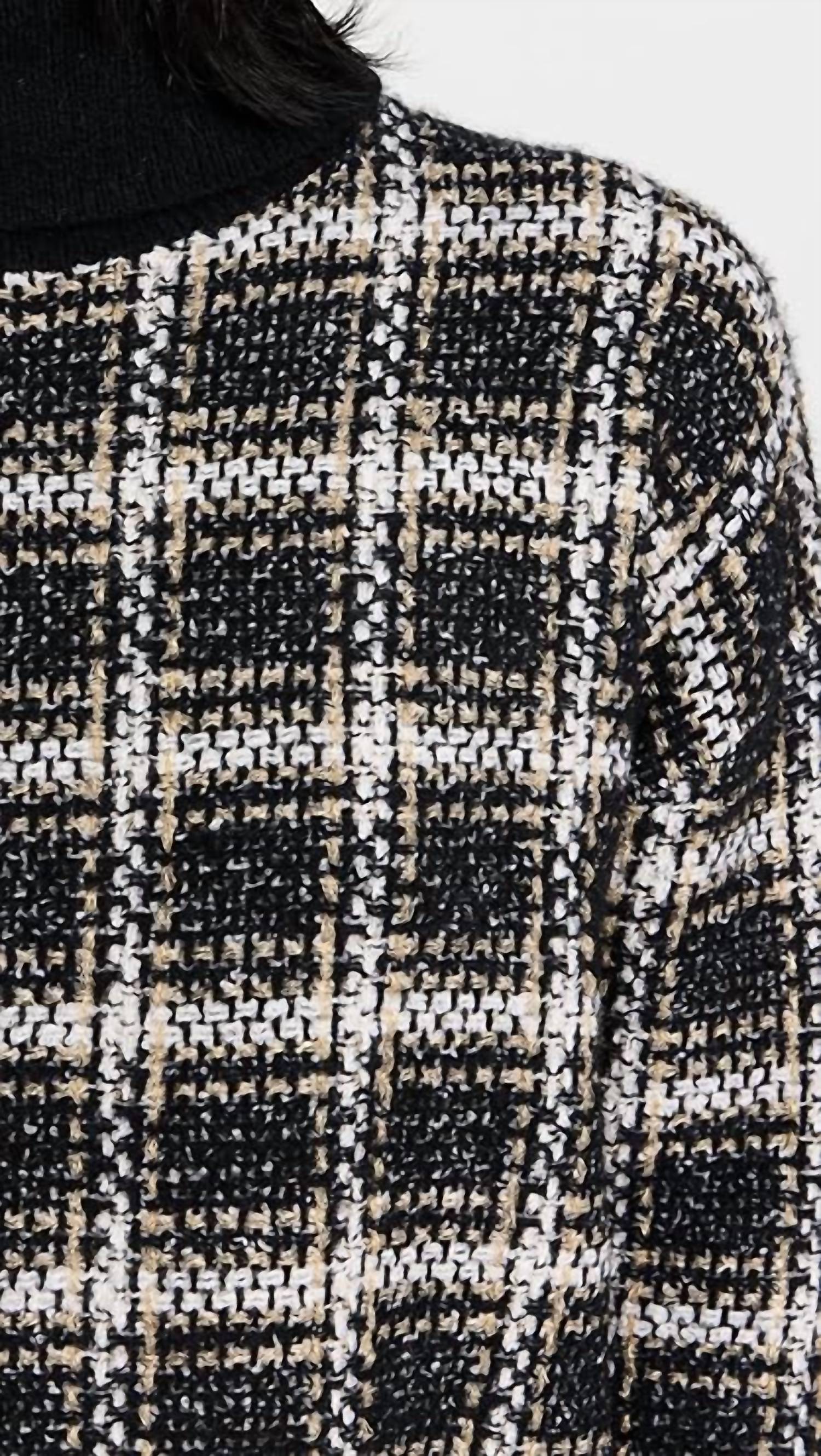 Layer under your favorite sweater or wear tucked into jeans for a perfectly polished winter look. Introducing the Ginny Plaid Knit Turtleneck Sweater by Splendid, a chic addition to your winter wardrobe in a black, white, and gold plaid pattern. This sweater features long sleeves and a cozy turtleneck, crafted from a luxurious blend of 46% nylon, 28% acrylic, 11% wool, 5% metallic, 5% alpaca, and 5% elastane. Designed for effortless style, it comes in a convenient pull-on style. Care instructions: Hand wash.