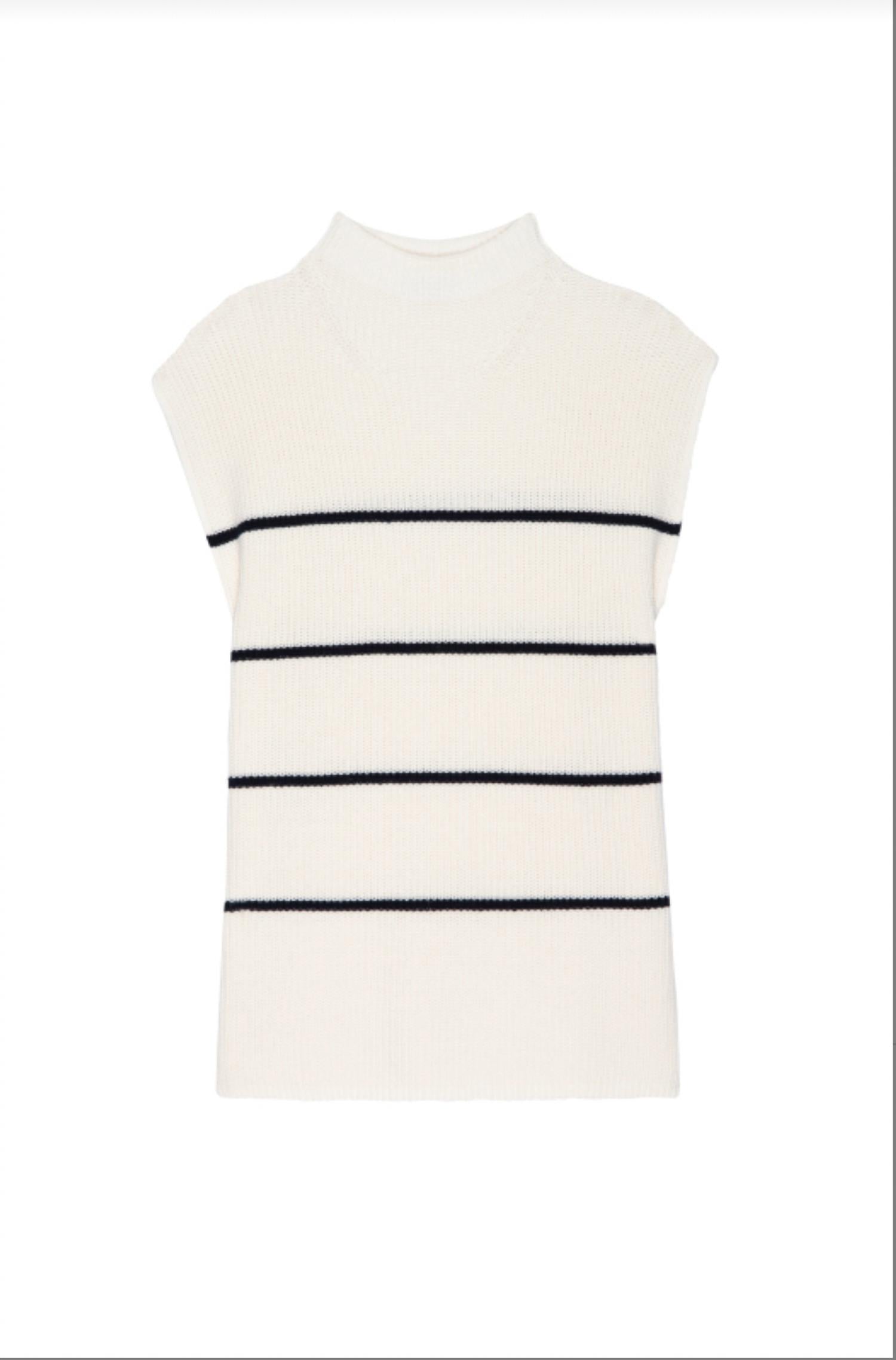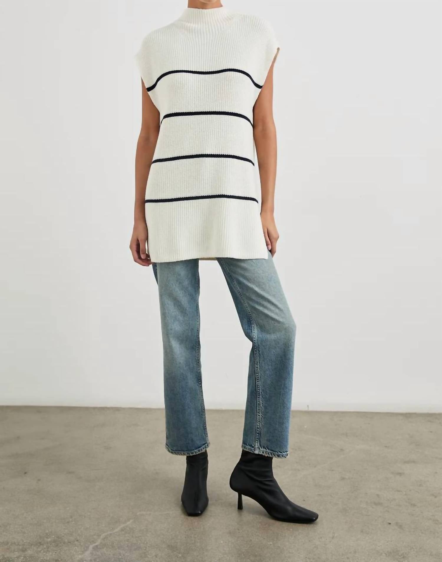 A classic staple that every closet needs. Blends comfort and elegance effortlessly. Crafted from a luxurious 95% Cotton and 5% Cashmere blend. Features a stylish mock neckline and a comfortable 25-inch length. Designed in a classic ivory navy stripe pattern. Pull on. Dry clean only.