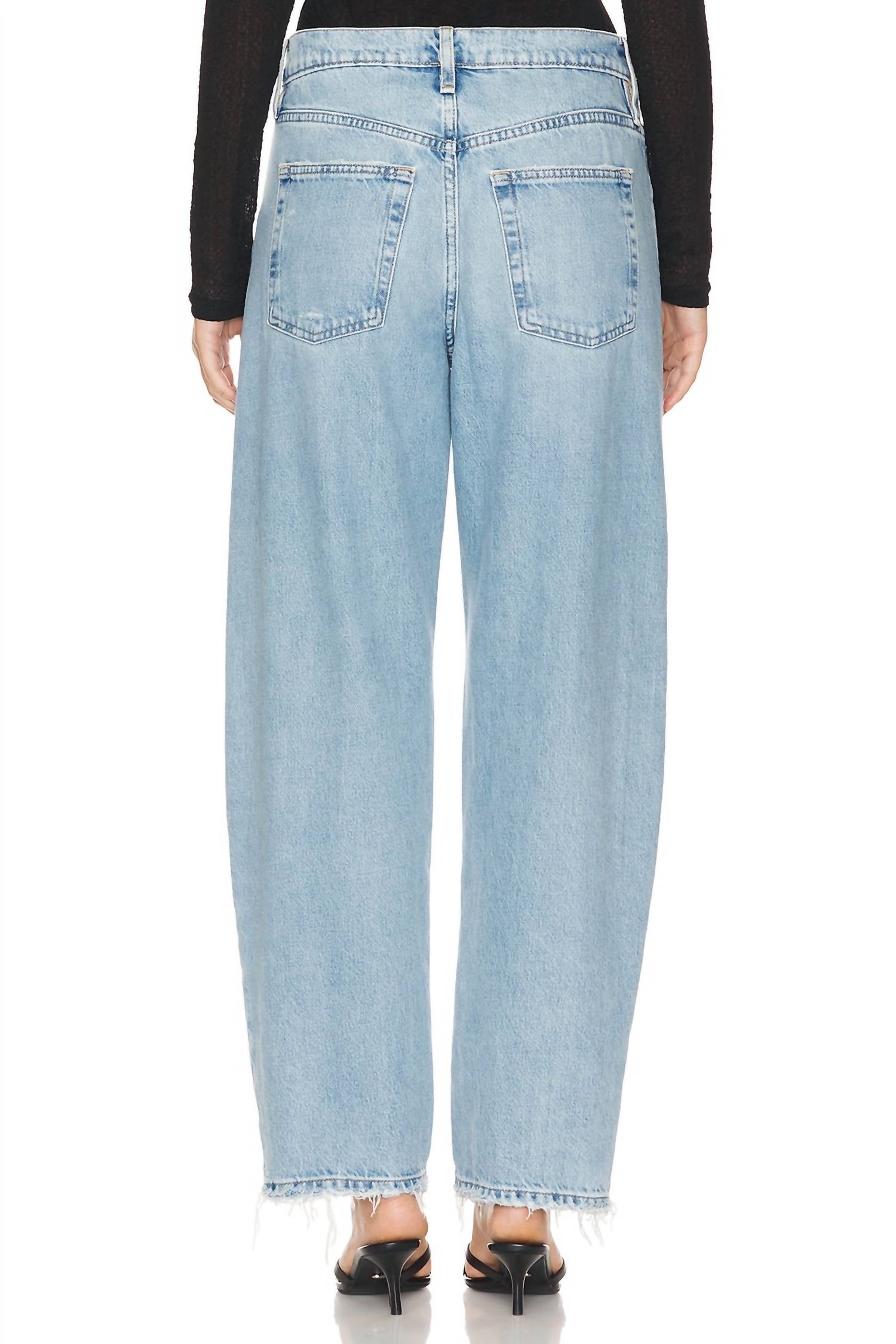 Discover the Low Slung Barrel Jeans by FRAME, crafted from 85% cotton and 15% recycled cotton for a sustainable touch. Made in Paraguay, these jeans offer a relaxed fit with a high-rise waist and a classic 5-pocket style. Designed in a medium wash color named Ziggy, they feature a convenient zip fly with button closure. For care, simply machine wash. The straight leg silhouette measures 22" at the knee, narrowing to 18" at the leg opening, making them perfect for travel this spring.