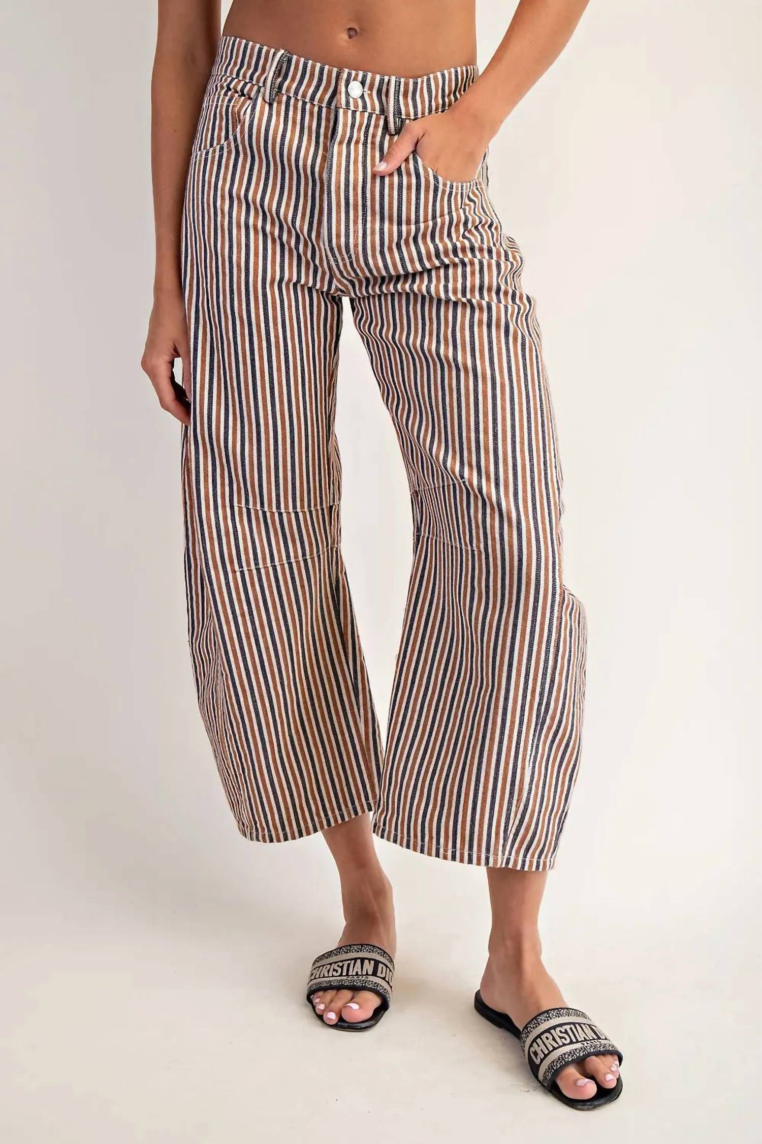 Pair these wide leg jeans with mules, slides or your favorite strappy sandals. Elevate your casual wardrobe with the Mineral Wash Striped Barrel Leg Jeans by ee:some, crafted from a durable blend of 85% cotton and 15% polyester for both comfort and style. These relaxed fit jeans showcase a charming burnt sienna hue with a playful stripe pattern, perfect for embracing a preppy vibe. The design features classic five-pocket styling and a convenient zip closure, ensuring practicality meets trendy aesthetics. Ideal for spring outings and holiday parties, these jeans promise to be your go-to for a stylish, laid-back look. Model is 5'9" and wearing a size small.