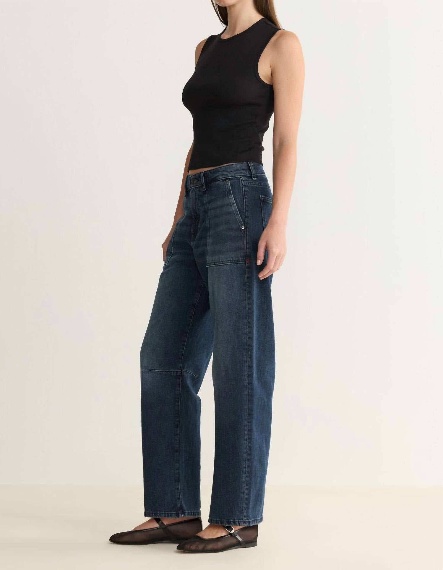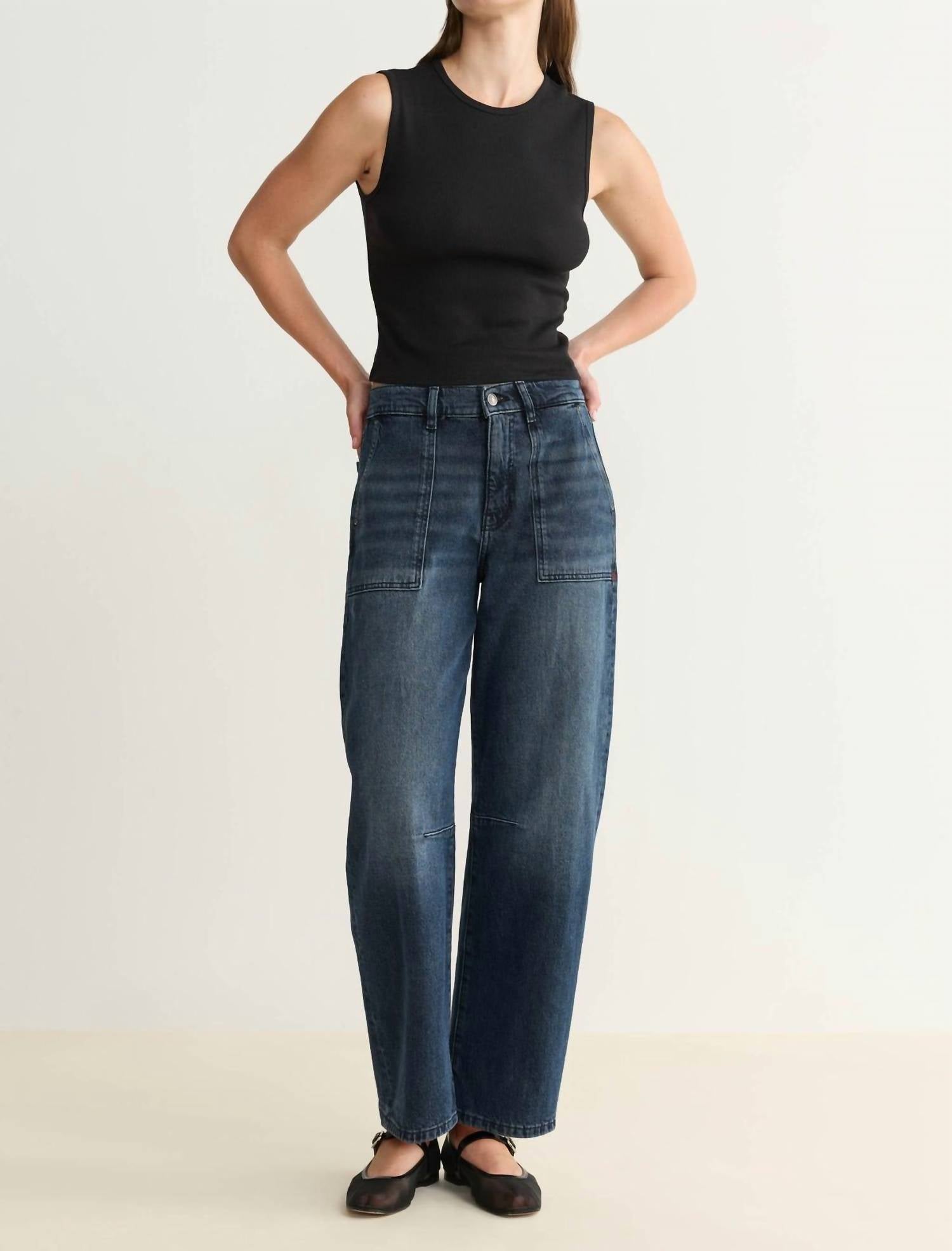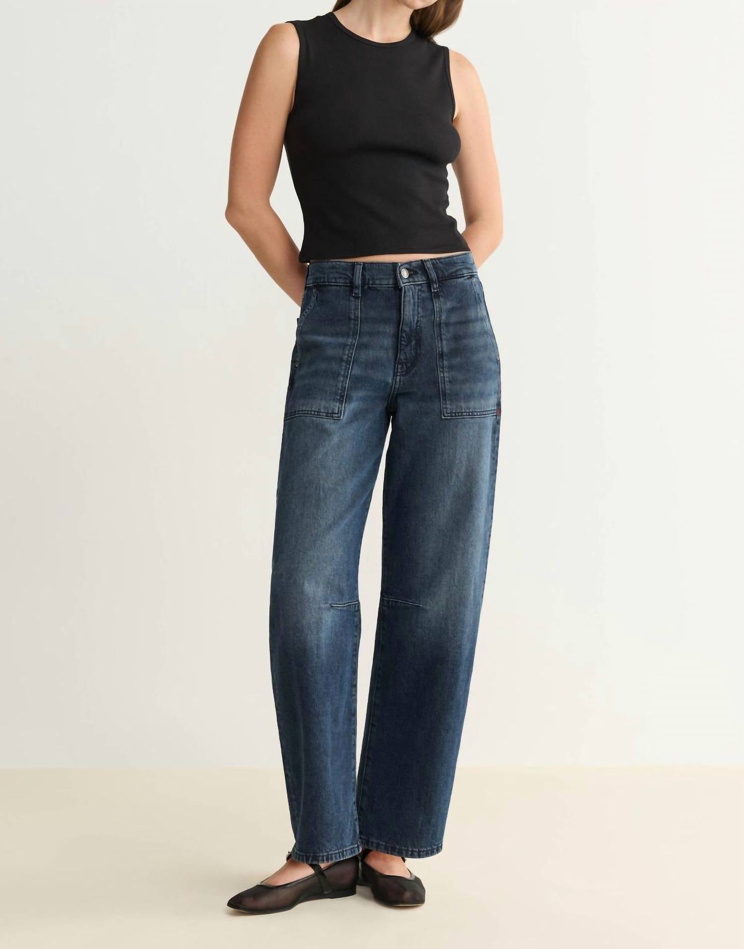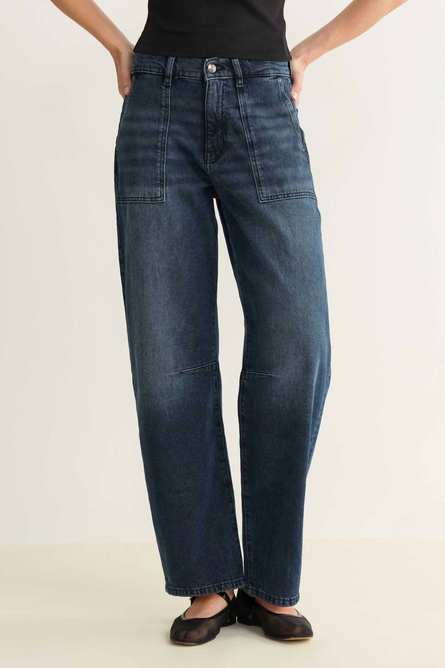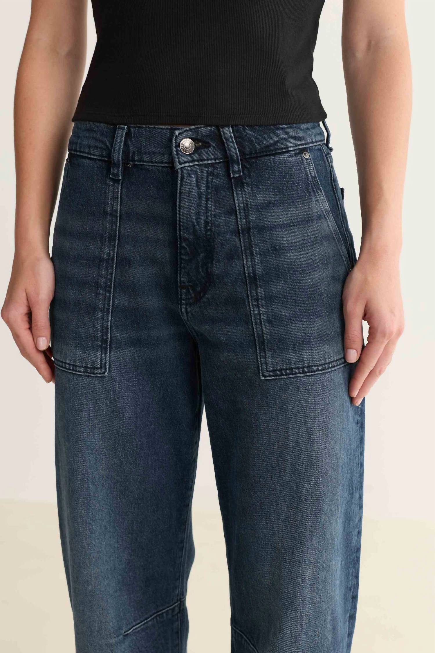 These must-have jeans are fit to perfection. Discover the BNA Soft Curve Barrel Jeans by Warp + Weft, designed for the modern woman with a nod to vintage style. These high-rise jeans feature a relaxed fit with a straight leg, crafted from 99% cotton and 1% lycra for a low stretch feel and ultimate comfort. The Saturday Night colorway is a dark, over-dyed blue wash with silver hardware and a clean hem, perfect for adding a touch of sophistication to your spring travel wardrobe. Inseam: 28", Rise: 11". Closure: Button closure. Care: Machine wash. Made from recycled and regenerative materials, these jeans are as kind to the environment as they are stylish.
