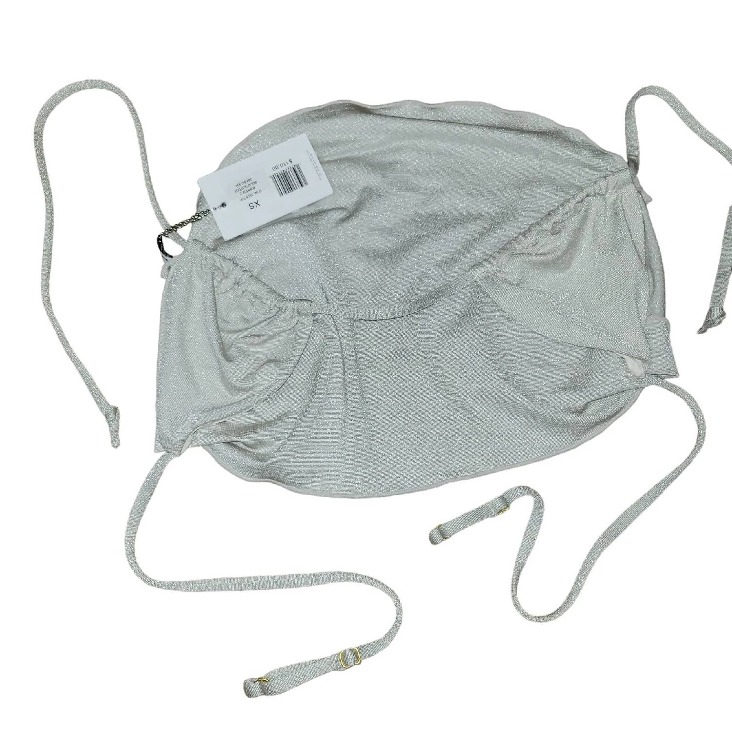 Ideal for relaxed poolside moments, this adorable swimsuit effortlessly transitions into the perfect sunset dinner outfit when paired with a flowing skirt. Introducing the Cowl Neck Bikini Top by We Wore What, perfect for a stylish beach day in metallic silver. This swim top features adjustable shoulder straps and a tie back closure for a customizable fit. Made in China, it's crafted from a luxurious blend of 80% nylon, 14% metallic, and 16% spandex with a textured lurex fabric that shimmers beautifully in the sun. Care for this eye-catching piece with a simple hand wash.