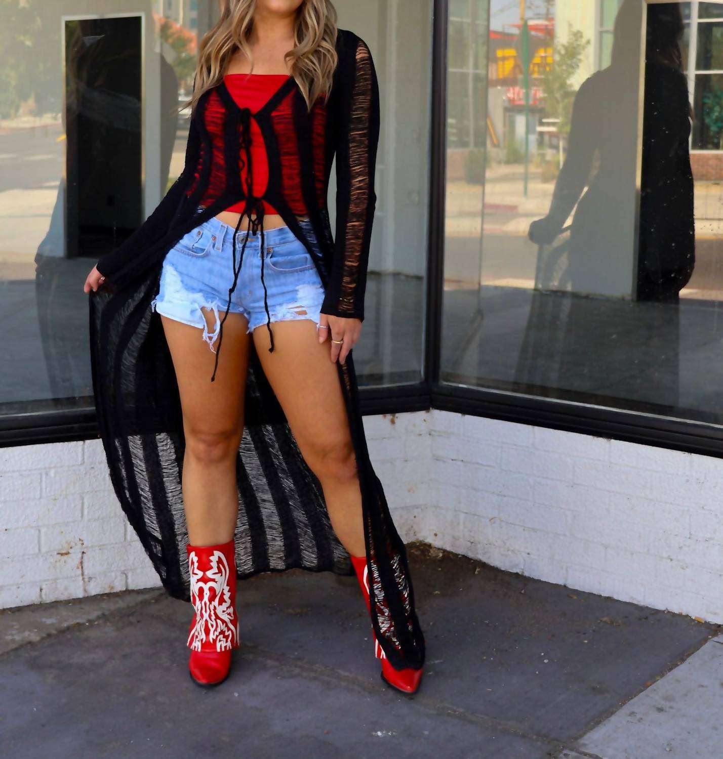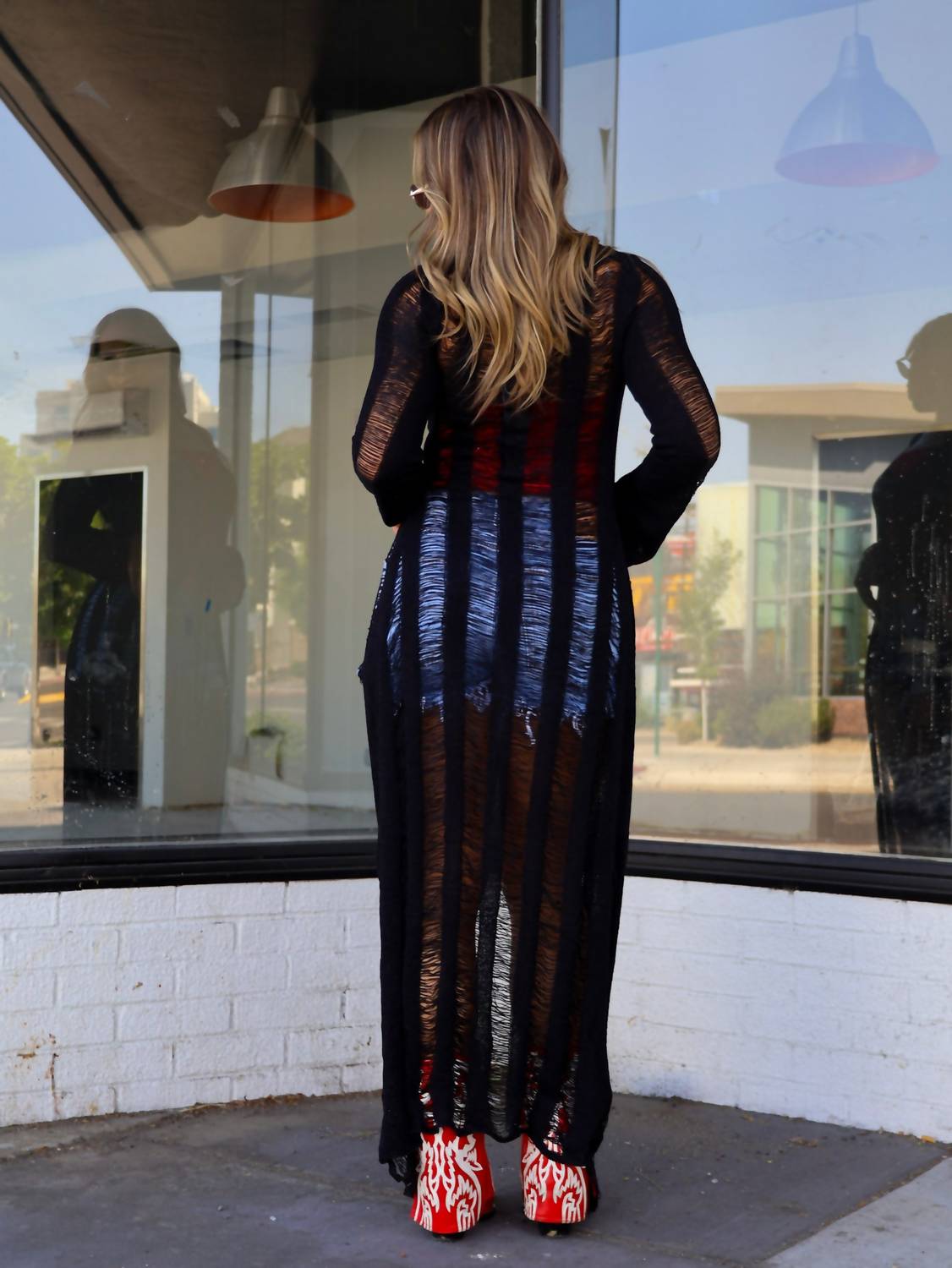 A comfy-all-day coverup that works just as good at dinner as it does by the pool. Elevate your summer style with the Desert Breeze Cover Up by TIC TOC. Featuring long fitted sleeves crafted from a lightweight and stretchy fabric, this full-length piece embraces a distressed ladder-knit design in a breathable semi-sheer acrylic and nylon blend. The versatile open front with adjustable tie closures ensures it layers perfectly over swimwear or festival ensembles. Available in off-white or black, this cover up is ideal for making a statement from beach to boardwalk.