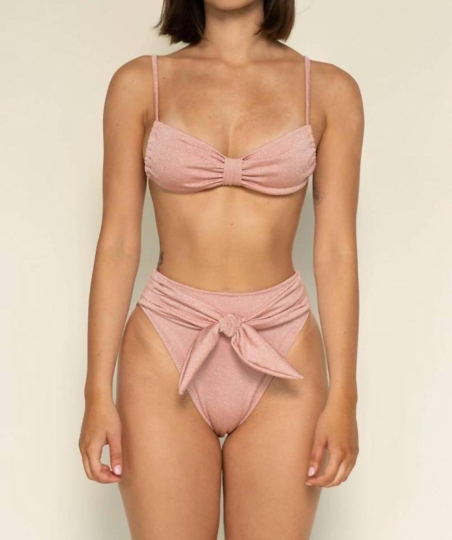 Ideal for relaxed poolside moments, this adorable swimsuit effortlessly transitions into the perfect sunset dinner outfit when paired with a flowing skirt. Discover the Montce Paula Tie-up Bikini Bottom, a chic addition to your summer swimwear in Prima Pink Sparkle. This high-waisted bikini bottom is crafted from a luxurious viscose blend with a shimmer pink hue and features full front coverage and a high-leg French cut to elongate the leg. The oversized self-tie bow elegantly creates an hourglass shape while the ruched back adds a flattering accentuation. Composition includes 75% viscose, 10% nylon, 10% metallic fiber, and 5% spandex, with additional lycra layers of 80% nylon and 20% spandex. Care instructions: Hand wash only. Perfect for a trendy, minimalist beach day vibe.