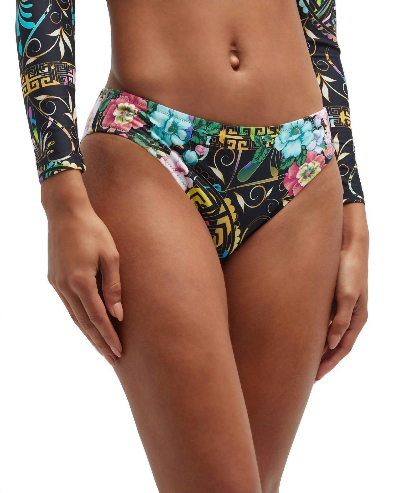 83% Polyamide, 17% ElastaneImportedCierre de Pull OnHand Wash Only83% Polyamide/ 17% ElastineLinedMeasurements for Size Small: Waist 29 1/2"Swim in style with this floral hipster bottom that features a comfortable lining and elegant print. The Floral Peace Hipster Bottom is a smart addition to your swimwear collection with its contrasting tones and sophisticated floral print. Spruce up your beach look with a neutral coverup to make the print of this hipster's bottom stand out.