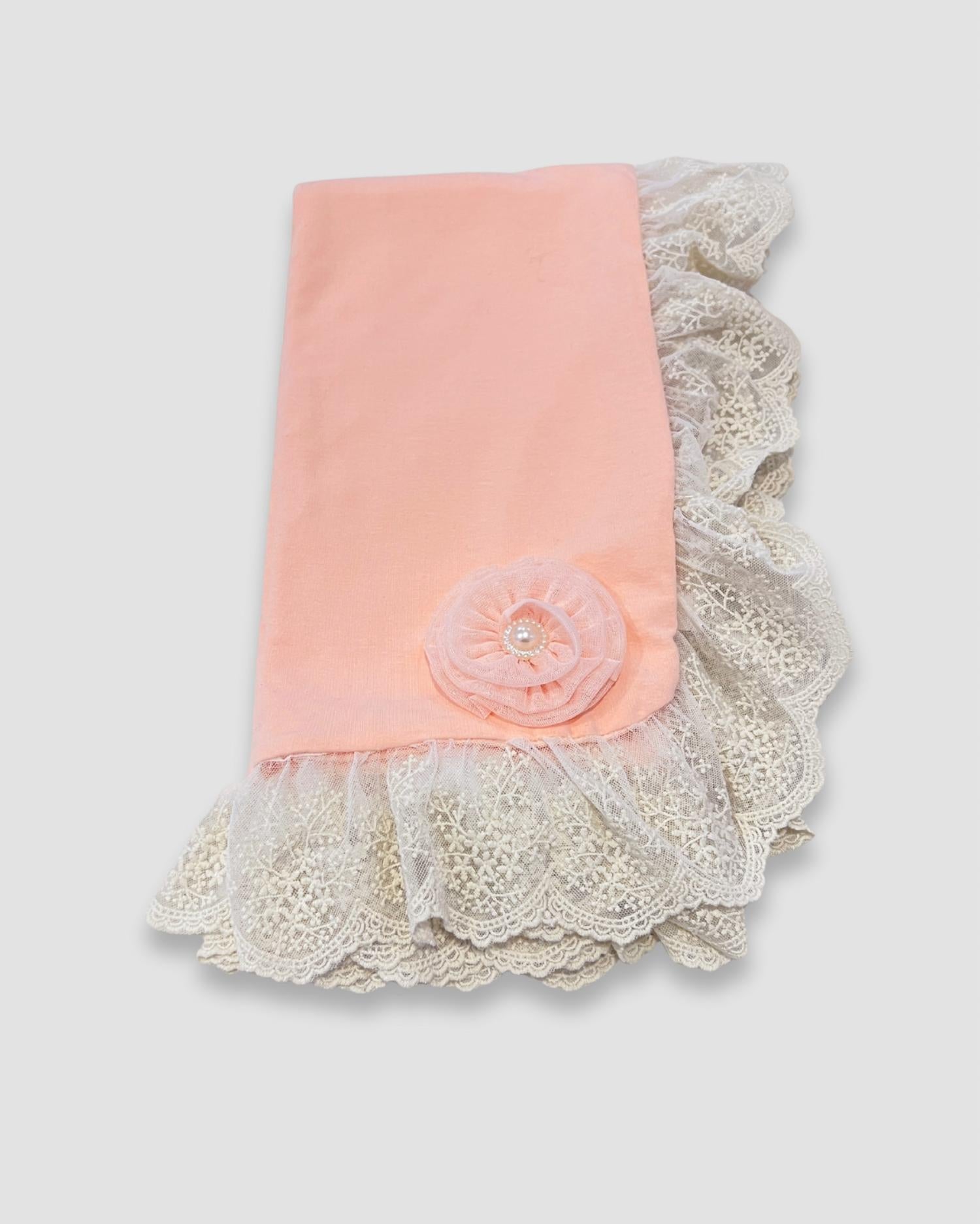 Introducing the Baby Blanket With Lace Trim by Haute Baby, crafted in a delicate peach hue perfect for little girls. This elegant blanket is adorned with intricate ivory lace trim and features a soft chiffon rosette with a pearl center for an added feminine touch. Made from a breathable cotton blend, it's ideal for wrapping, gifting, or as part of nursery décor. Please note care instructions are not provided, so handle with gentle care to maintain its heirloom quality.
