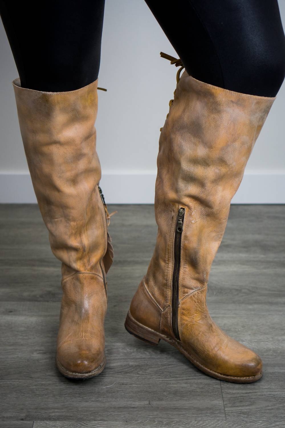 Say hello to the perfect, most versatile boot. The ankle height makes this style easily transition from day to night. Wear them with your favorite skinny jeans and tee for a more laid back look, or pair them with your favorite mini dress and jacket for a night out on the town. Discover the BEDSTU Women's Manchester Wide Calf Boots, a streetwear staple in sophisticated brown. Crafted from chrome-free, vegetable-tanned leather, these tall boots feature an 18-inch shaft and an adjustable circumference of 16.25 to 17 inches, thanks to the leather lacing. Designed with comfort in mind, they come with a cushioned insole and a practical half inner zipper for easy wear. Made in Leon, Mexico, these boots boast a 1-inch leather stacked block heel, perfect for making a seamless transition from summer to fall in style.