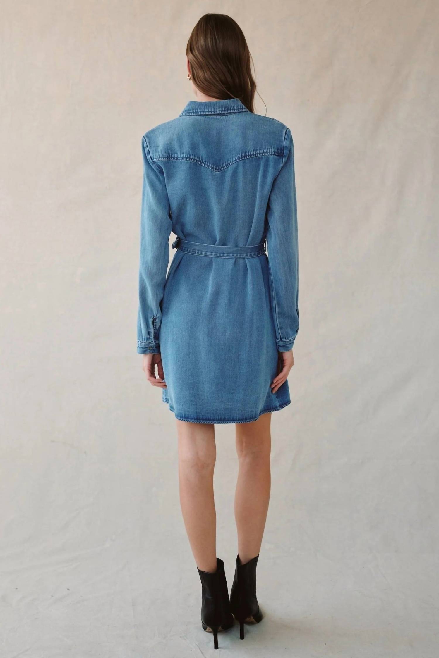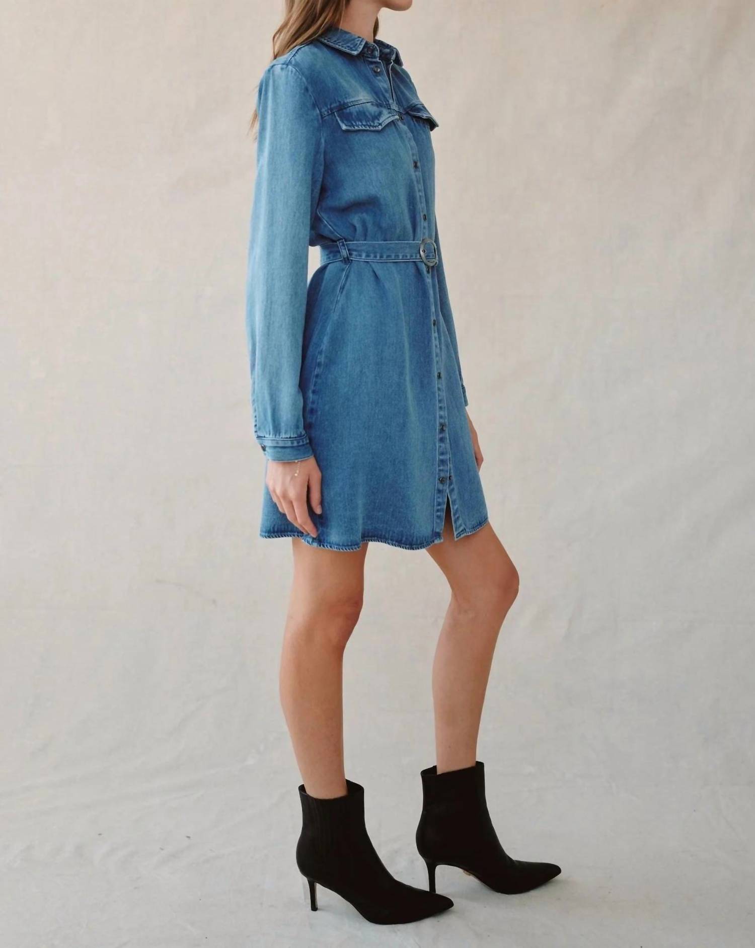 Pair with your favorite sandals for an effortlessly chic look. Introducing the Flap Pocket Belted Shirt Dress by Bella Dahl, an ultra-soft denim piece in a timeless Medium Vintage Wash. This dress features long sleeves, a collared neckline, and a flattering 35" length for size small. Crafted from 100% Lyocell, it offers a chic button closure complemented by a D-ring sash belt and functional front flap pockets. Care instructions: Machine wash.