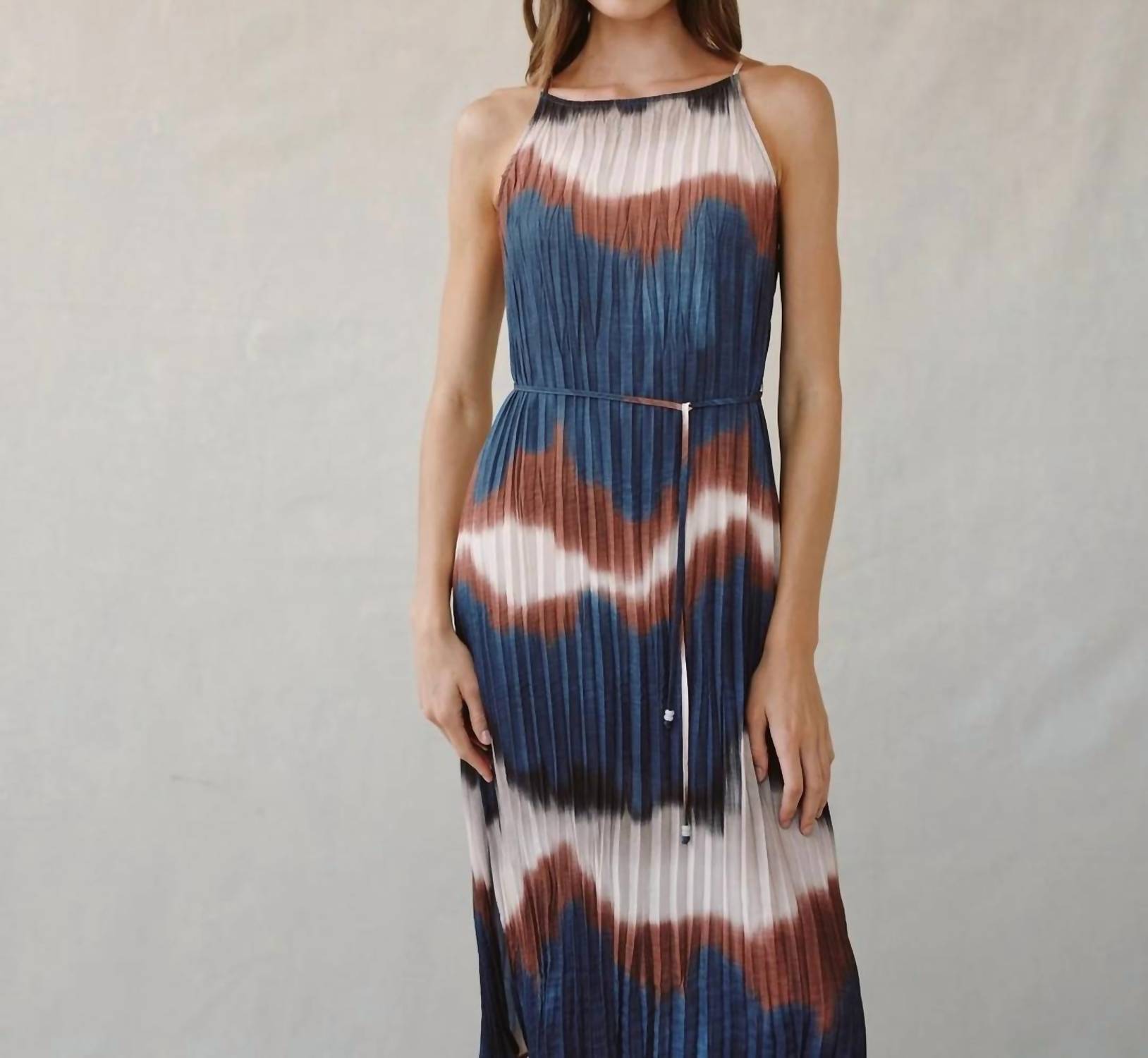 Just add slides or mules and you are good to go. Elevate your wardrobe with the Pleated Midi Dress With Side Slit by Bella Dahl, an ideal pick for transitional seasons and elevated everyday wear. This dress, adorned in the Midnight Tides print, features spaghetti straps and a luxurious 100% polyester composition. Designed with side slits for subtle movement, it includes a waist tie with bead detailing for a flattering silhouette. Closure: Button closure. Care: Machine wash cold. Imported for assured quality.