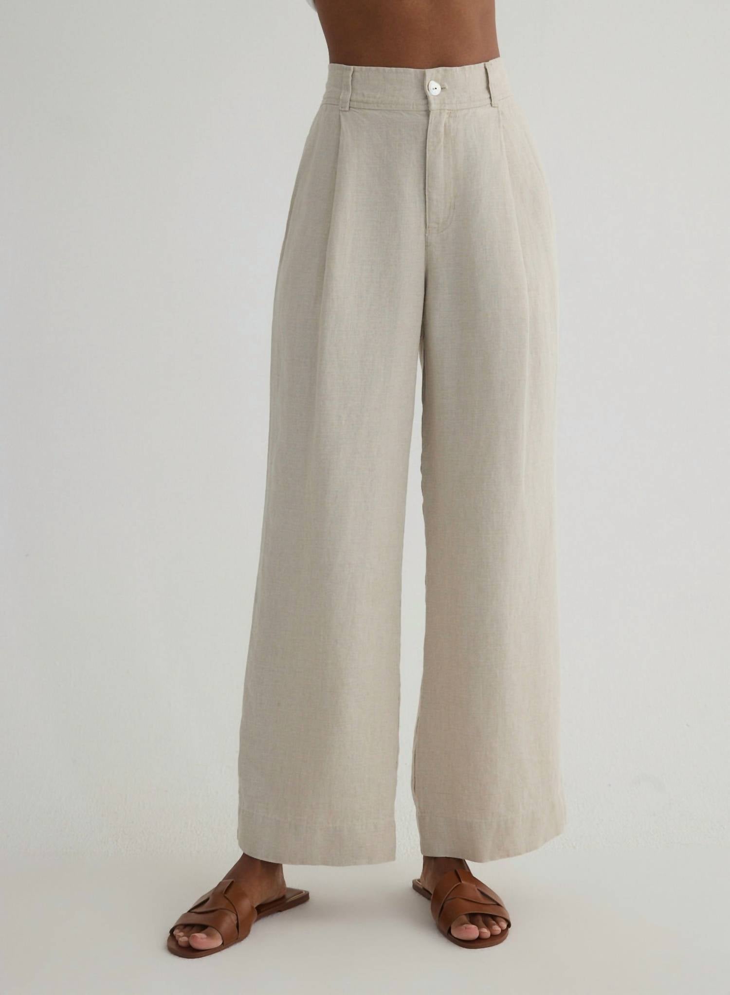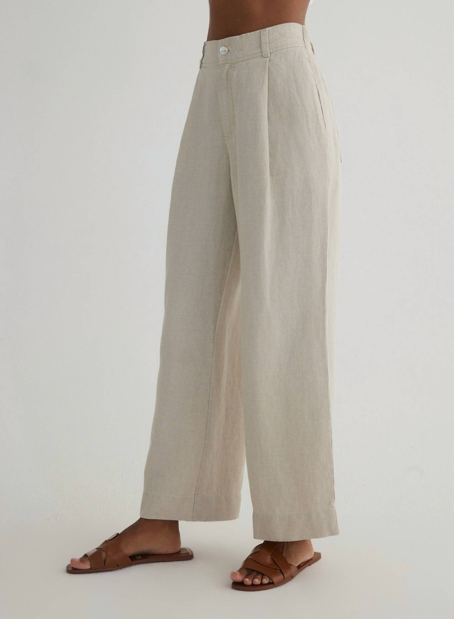 Introducing the Pleated Wide Leg Ankle Pant by Bella Dahl, a minimalist summer essential crafted for style and comfort. With a high-rise waist and soft front pleats, these pants feature a wide-leg silhouette and a 27.5-inch inseam for an ankle-grazing length. Made from 100% breathable Linen in a chic Sand hue, they include convenient pockets and a button closure. Perfect for vacation days, these pants are machine washable for easy care.