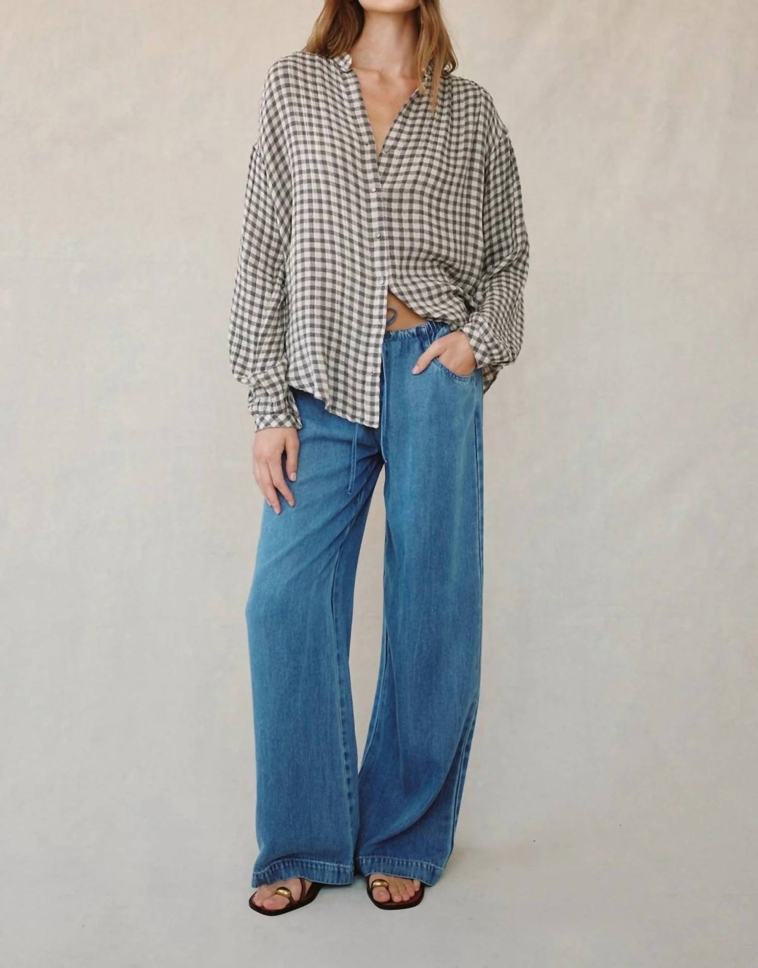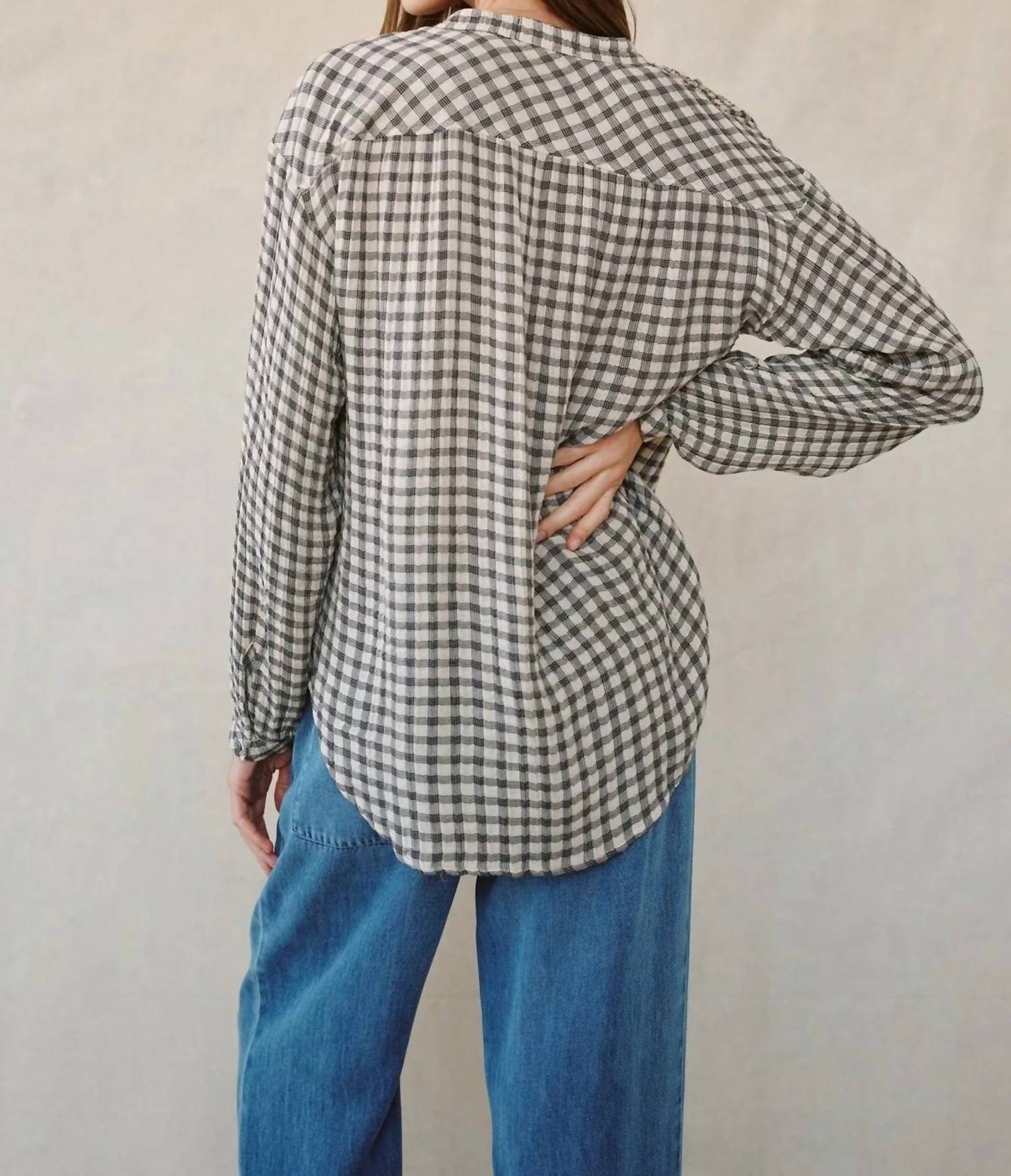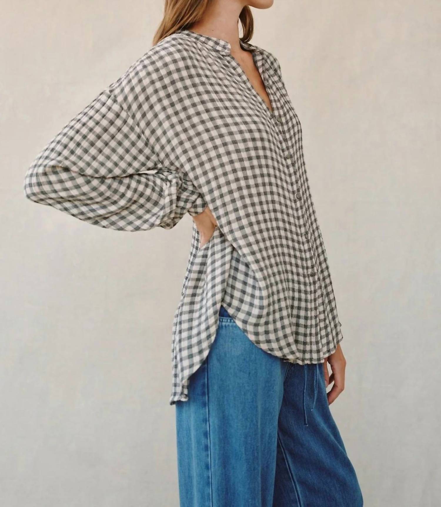 Introducing the Shirred Mandarin Collar Shirt by Bella Dahl, a perfect blend of comfort and style for the modern woman. This ivory check plaid shirt features long shirred sleeves and dropped shoulders, creating a relaxed fit ideal for any occasion. Crafted from a soft cotton blend comprising 55% rayon, 22% cotton, 22% tencel lyocell, and 1% spandex, it measures 27 inches in length for size small. Made in the U.S.A., the shirt offers a classic button front closure and is easy to care for with machine wash instructions.