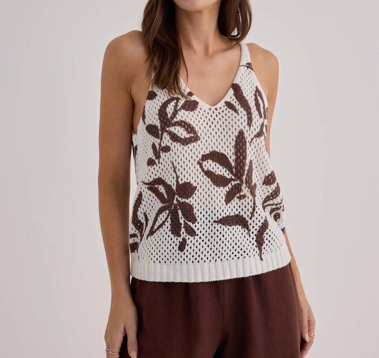 The perfect tank top for those warmer weather seasons. Embrace effortless elegance with the Sleeveless Sweater Top by Bella Dahl, ideal for your next vacation. This sleeveless top, crafted from 100% cotton in a textured brown palm print, features a striking V-neckline at both the front and back, combining allure and sophistication. Made with a pull-on design, this lightweight, breathable piece is perfect for laid-back, boho chic style. Care instructions are simple: machine wash cold for ease and convenience. Model is 5’10” and is styled in a size XS.