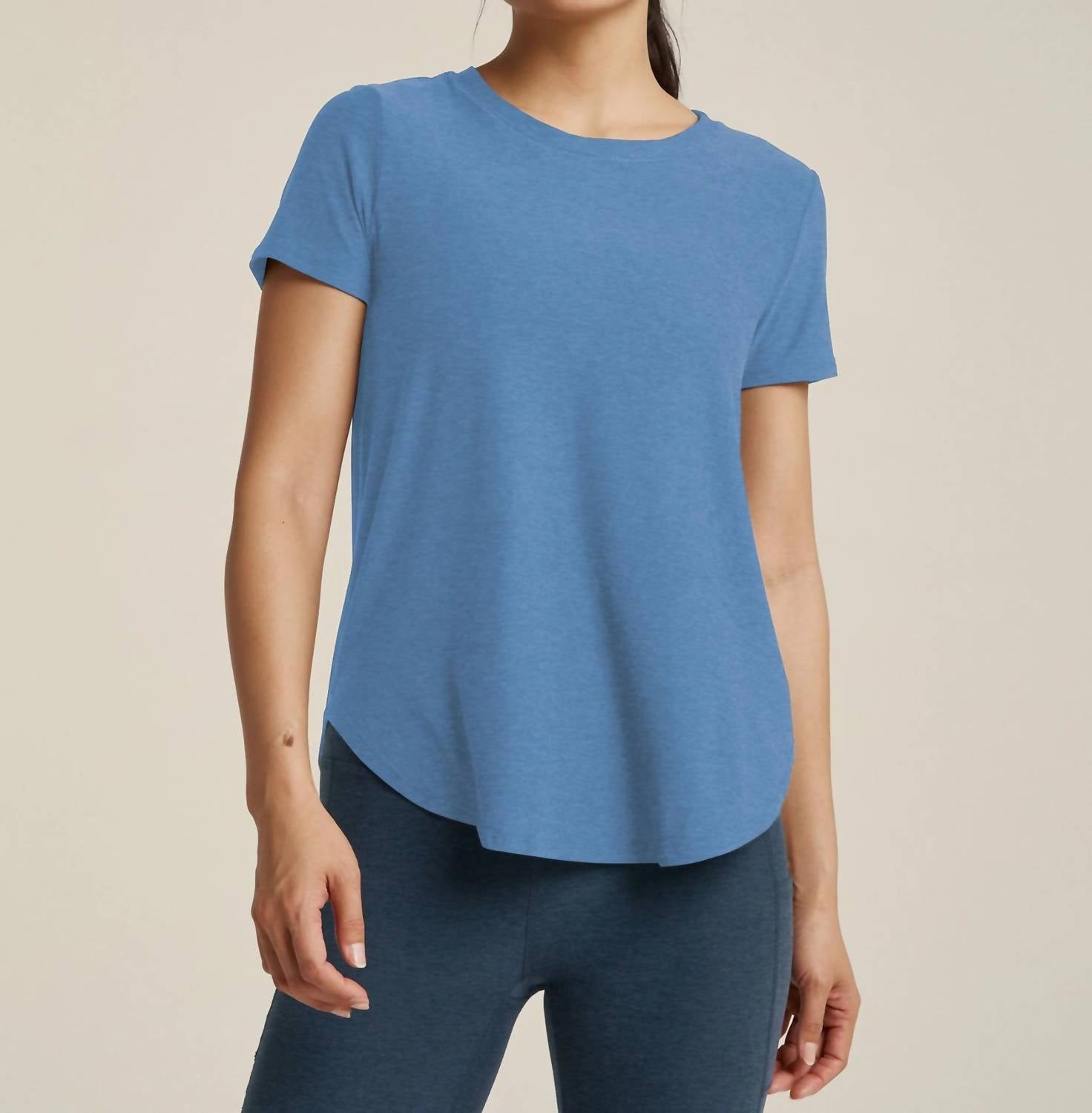 Look no further, you just found your perfect tee! Discover the On The Down Low Tee by BEYOND YOGA, a relaxed-fit essential in a serene Sky Blue. Featuring short sleeves and a long length, this tee is crafted from Featherweight Spacedye Polyester, ensuring lightweight comfort. Closure: Convenient pull-on style. Care: Machine wash and tumble dry. Perfect for pairing with leggings or jeans for a minimalist and everyday look.