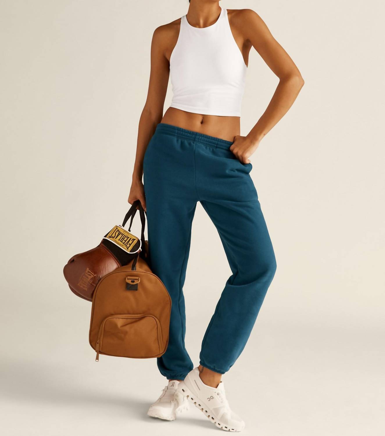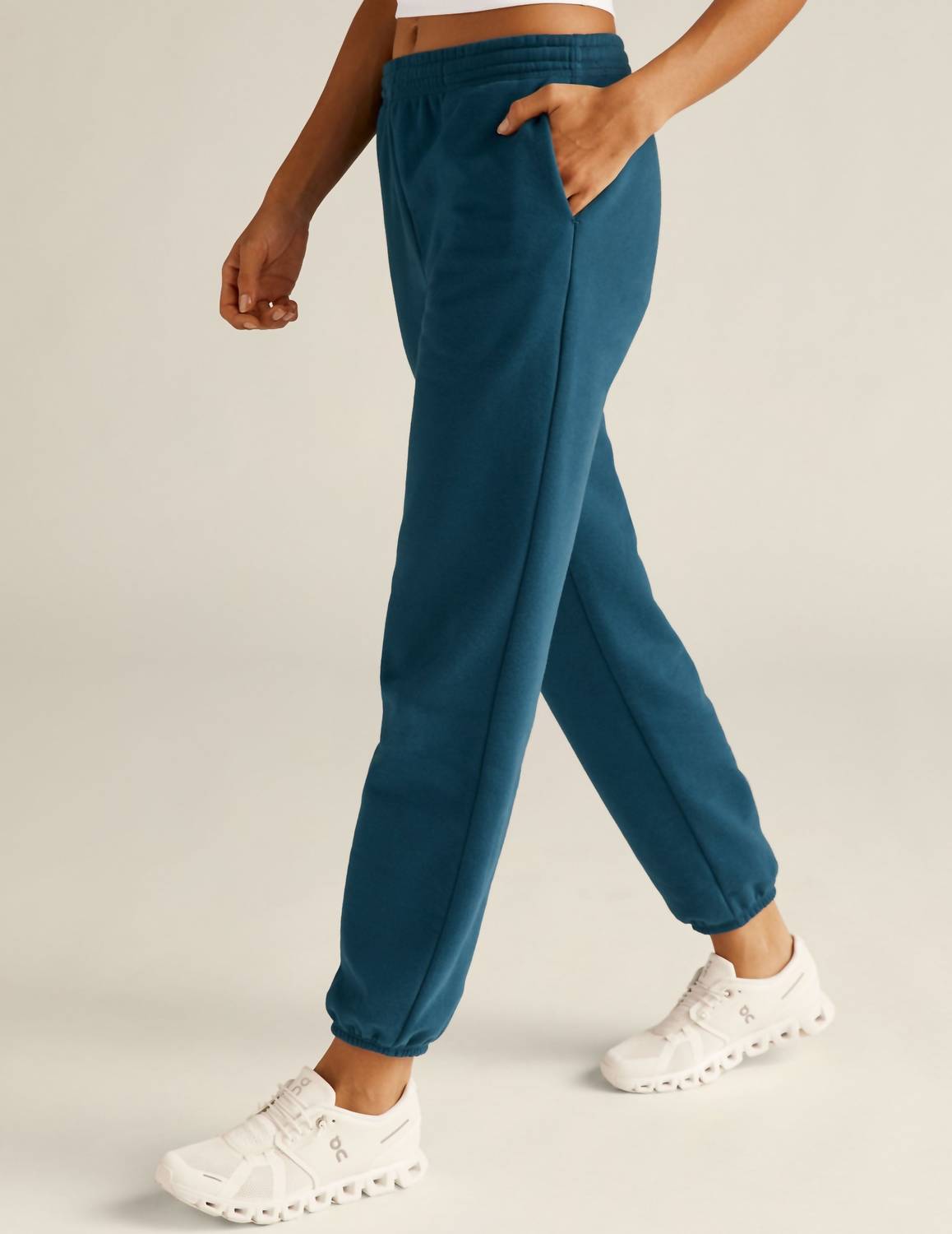 The perfect pant for running around town and looking cool while doing it. Upgrade your activewear collection with the On The Go Fleece Jogger by BEYOND YOGA in Blue Gem. Designed and assembled in the USA, these joggers offer a relaxed fit with a mid-rise, elasticated waistband, and a 28.75" midi-length inseam for ultimate comfort and style. Crafted with on-seam pockets and elasticated cuffs, they exude a sporty, post-workout vibe. Closure: Pull on.