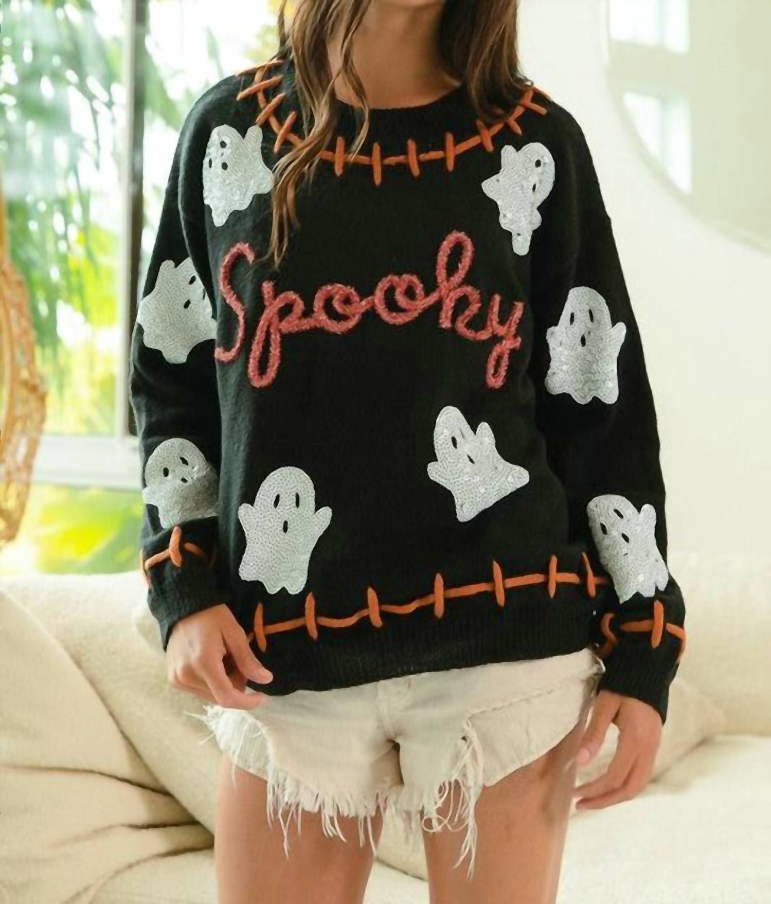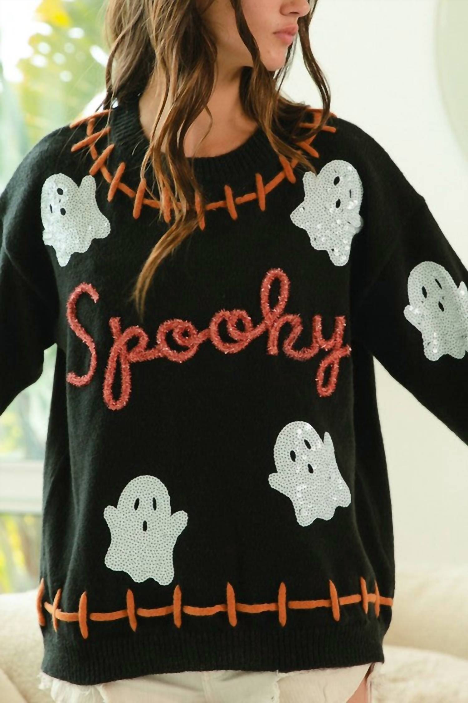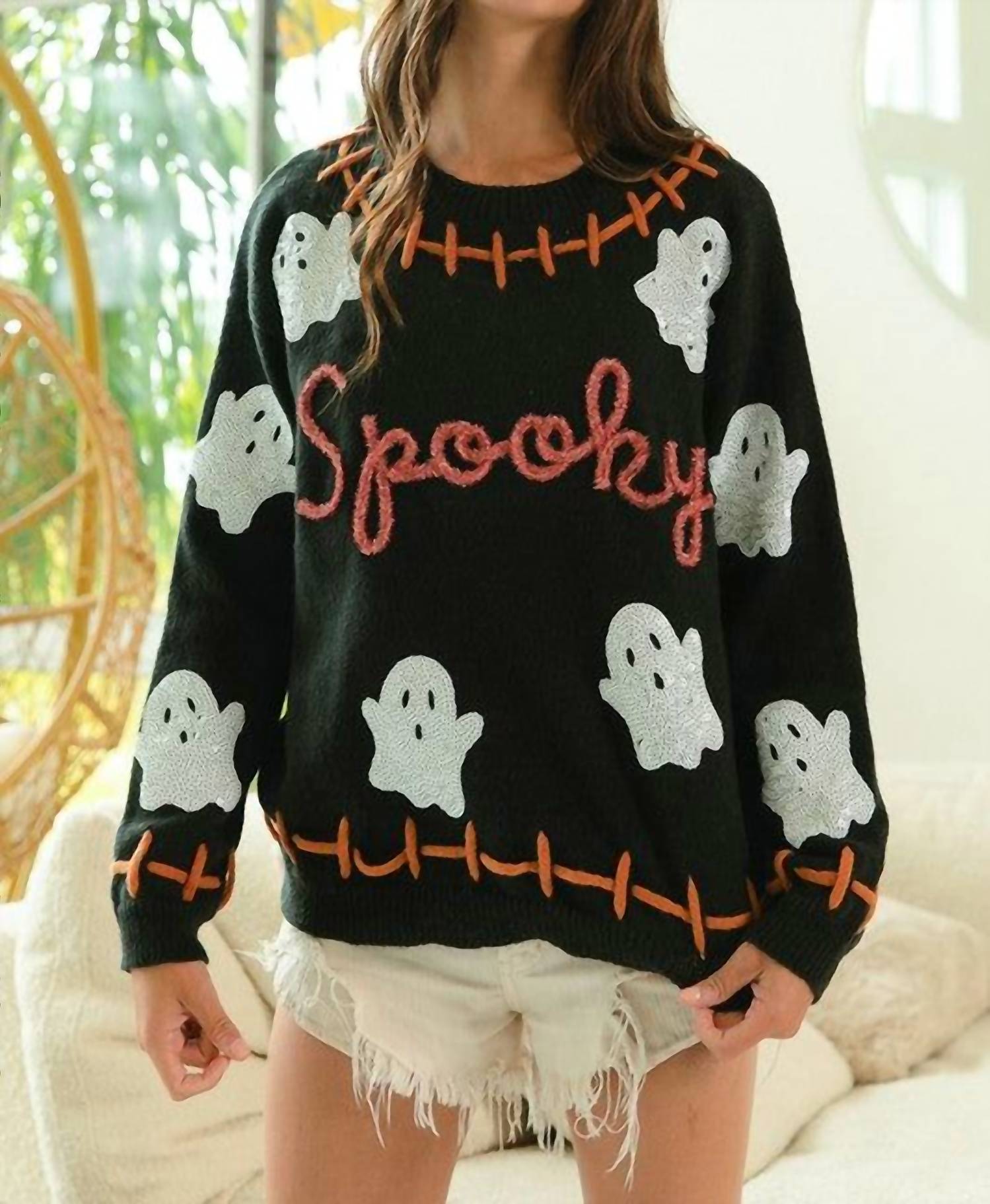 Stay warm and stylish in this versatile and effortlessly cool knitwear staple. Wear it alone or layered, it's the perfect sweater for the season and you'll wish you had it in every color. Embrace the Halloween spirit with the Spooky Sweater by BiBi, a perfect addition to any festive occasion. Crafted in a maximalist graphic pattern, this sweater showcases a playful and quirky style. Featuring long sleeves and a classic crewneck, it's designed to keep you cozy and stylish throughout the fall season. This pull-on sweater comes in a versatile black, ensuring you stand out while enjoying the festivities.