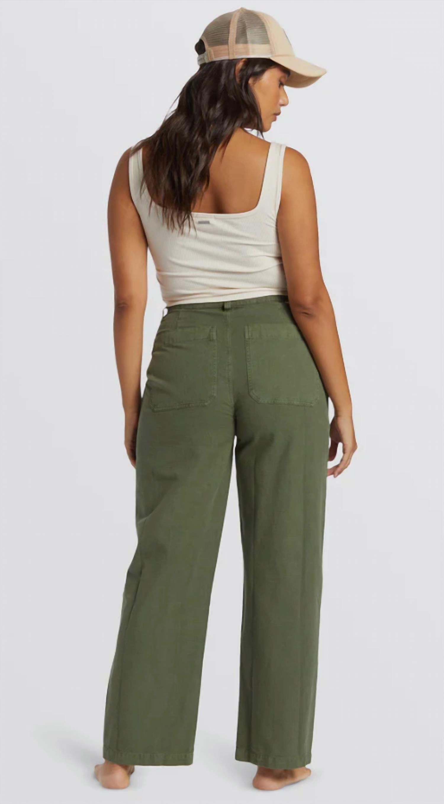 A straightleg pant that workes season after season. Dress these up with your favorite blouse or keep it casual with your go-to tee. Introducing the Stay Grounded Pants by Billabong, designed for women who prioritize both comfort and style. Crafted from 100% cotton with a solid Treehugger hue, these pants feature a high-rise waist with a 12.5-inch rise and a 31-inch straight leg inseam. The button closure and multi-pocket design make these pants both functional and versatile. Care instructions specify machine wash and lay flat to dry, ensuring longevity and ease of maintenance.
