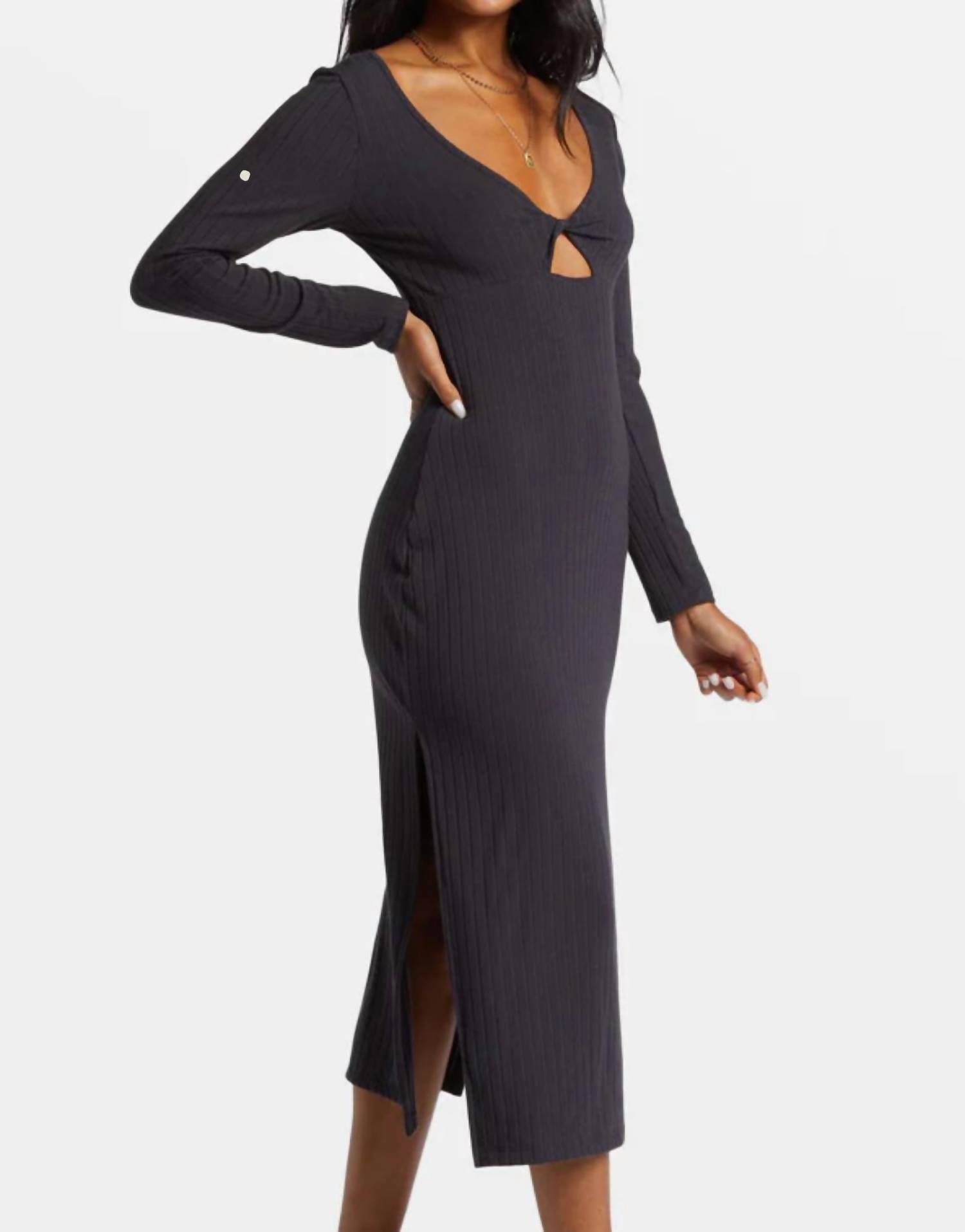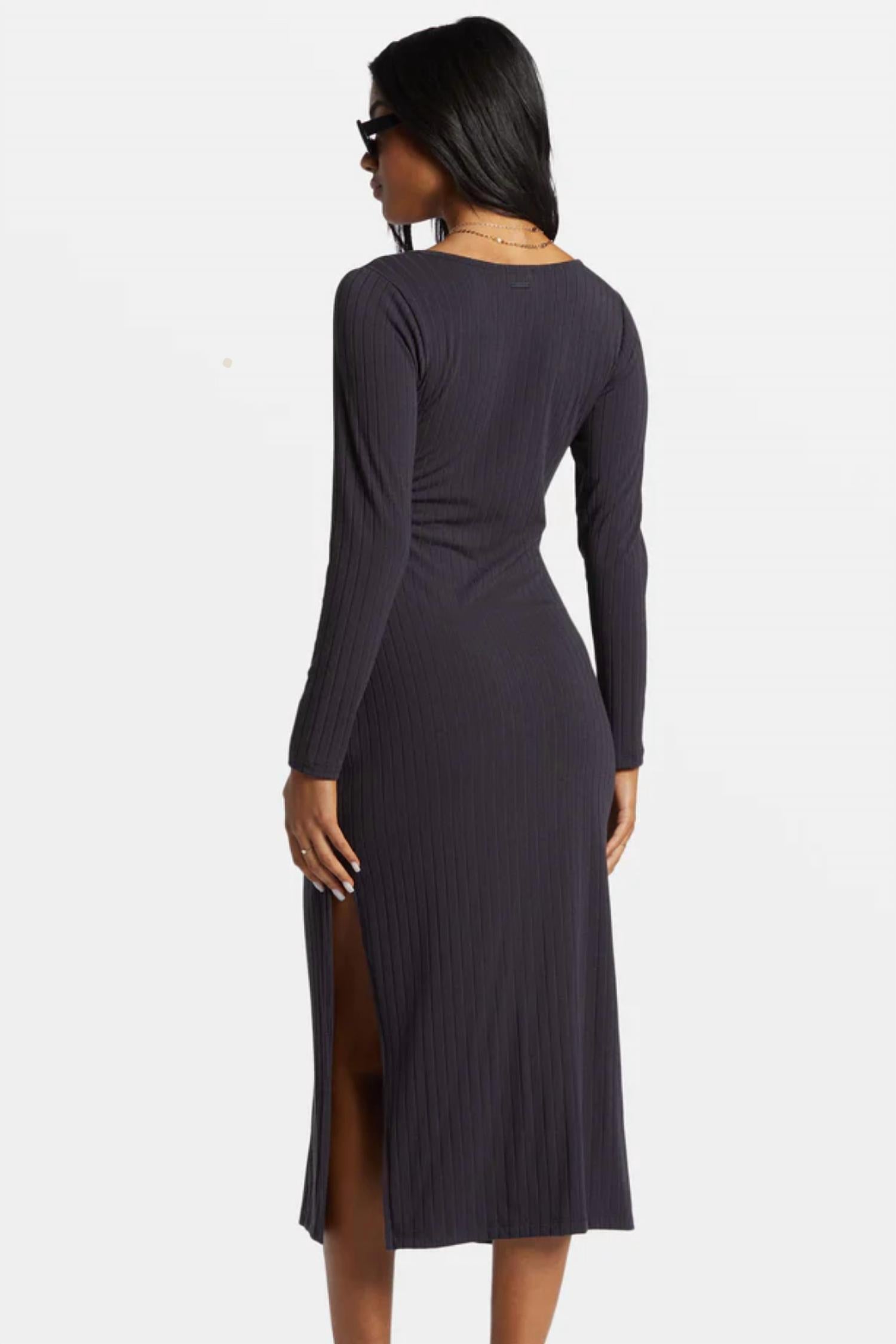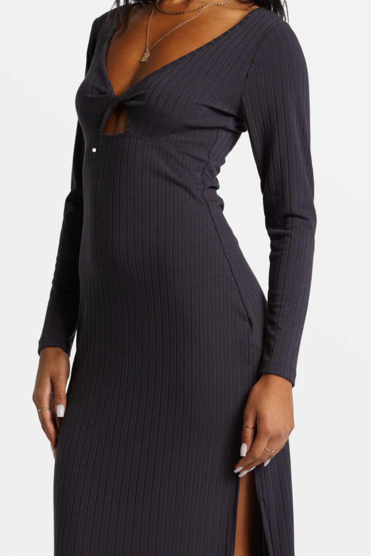 A midi dress so versatile, your options for wearing it are endless. Unveil sophistication with Billabong's Second Look Midi Dress in a striking Black Sands hue. This dress boasts long sleeves and a captivating V-neckline with a twist detail at the front bodice, enhancing its bodycon silhouette. The pull-on style offers effortless wear, while the leg slit adds an alluring touch. Material: 100% Polyester. Model is wearing a size small.