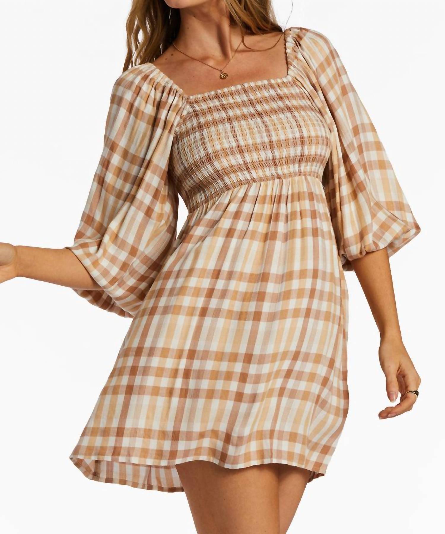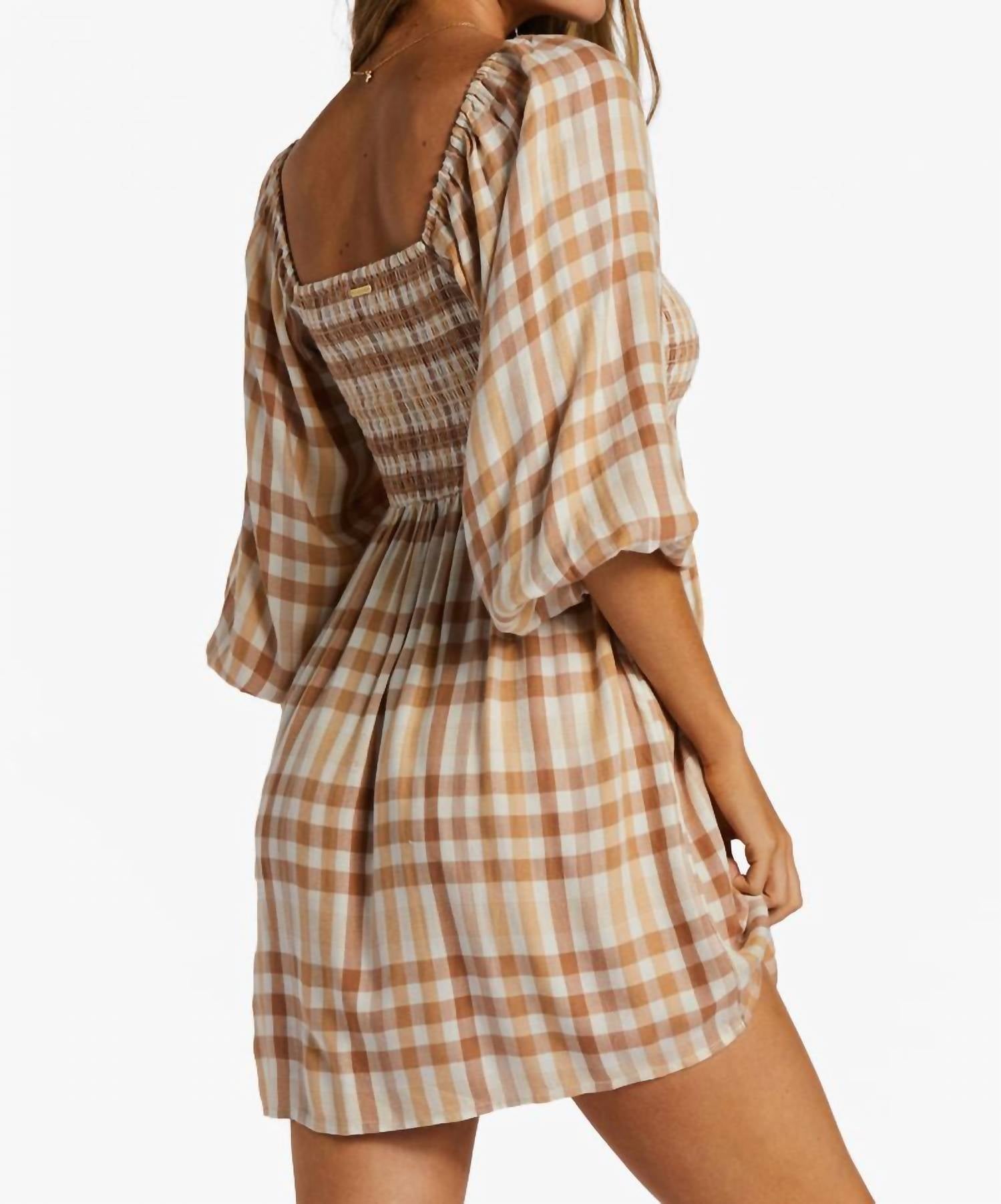 The kind of easy and flattering dress you'll be reaching for all season long. Embrace the allure of the Paradise Days Mini Dress by Billabong, a playful piece in a truffle shade from the Castles In The Sand collection. This dress features three-quarter puff sleeves and a charming A-line silhouette, accentuated by a smocked bodice and plaid & check pattern. Crafted from soft crinkle viscose fabric with a flattering square neckline, it ensures both comfort and style for any occasion. Closure: Pull on. Care: Hand wash and line dry.